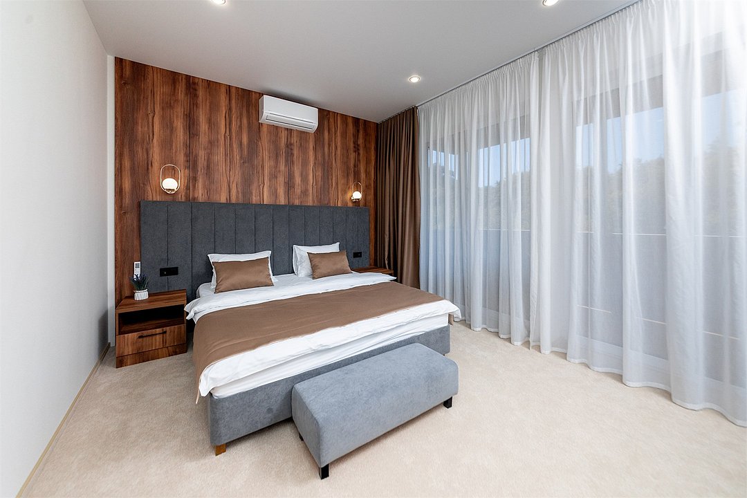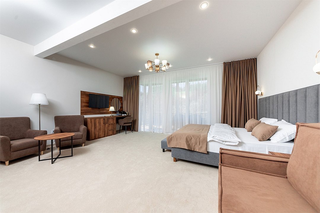 Номер класса «Гранд люкс» - это жемчужина комплекса , рассчитанный на самых взыскательных наших гостей. Роскошный и действительно просторный номер с уникальным дизайном впечатляет современными удобствами, необычным европейским интерьером и дизайнерской мебелью. Насладитесь удобствами представительского номера. Внутреннее пространство номера разделено на несколько функциональных зон, в каждой из которых Вы найдете всё, что нужно для беззаботного отдыха. Отдельная просторная гардеробная комната. Комфортная двуспальная кровать и дополнительные спальные места в виде удобного раскладного дивана обеспечат Вам здоровый и безмятежный сон. Вся необходимая техника: плазменный телевизор, кондиционер, регулирующий температуру в помещениях, холодильник, электрический чайник, сейф с кодовым замком для хранения личных вещей. Кроме того, вас ожидают уютные тапочки, мягкие банные халаты и полотенца, полный комплект средств личной гигиены, а также дополнительные бесплатные услуги: доступ к высокоскоростному подключению к сети по WI-FI, бесплатное парковочное место на охраняемой стоянке при гостинице, тренажерный зал ,пользование бассейном , питание- завтраки . Большие окна номера открывают завораживающую панораму гор.Услуги и удобства