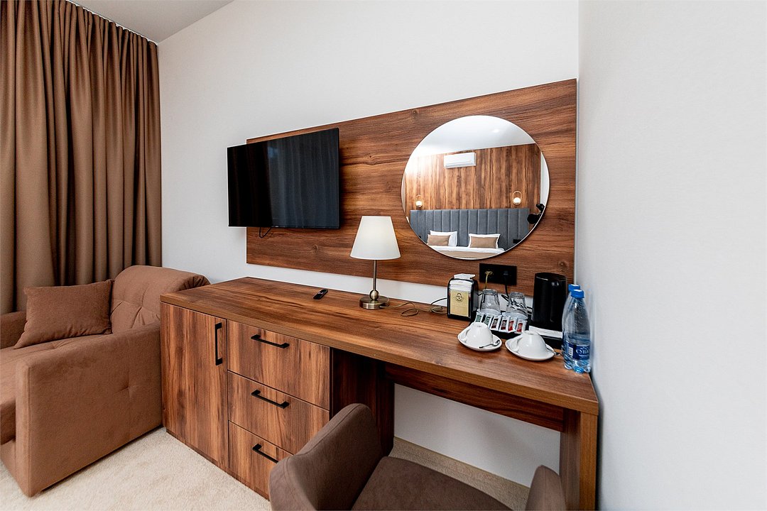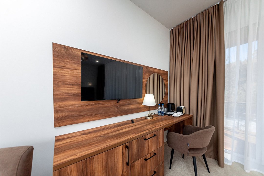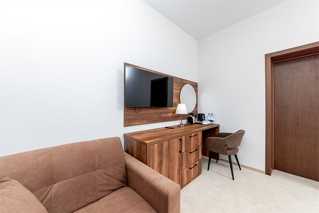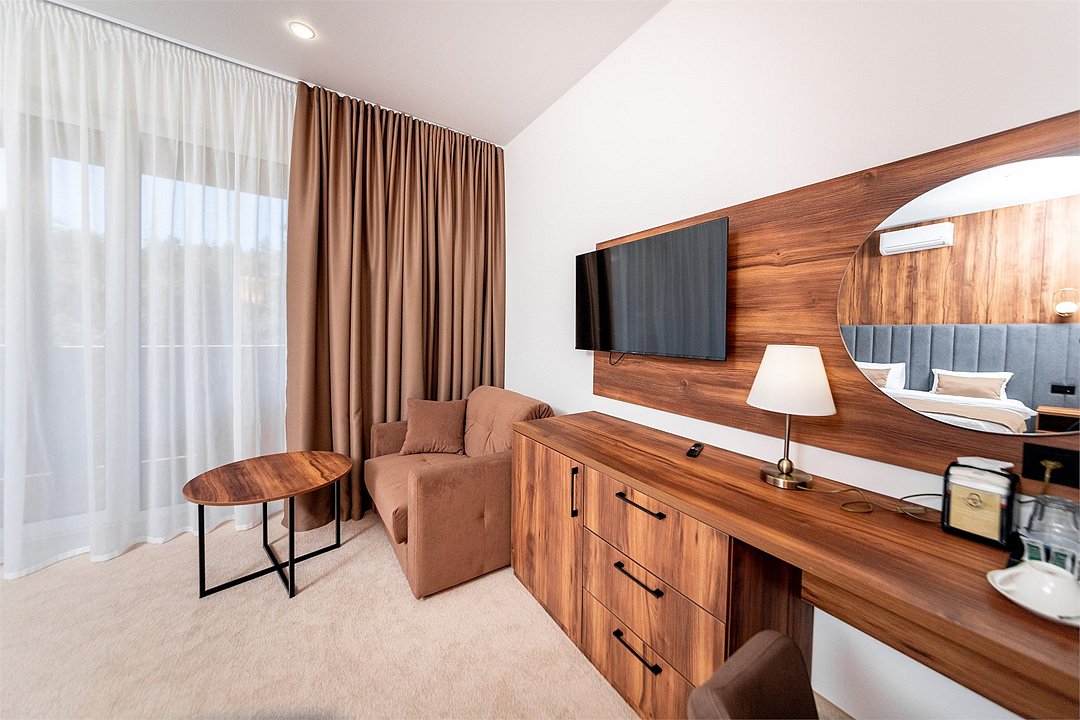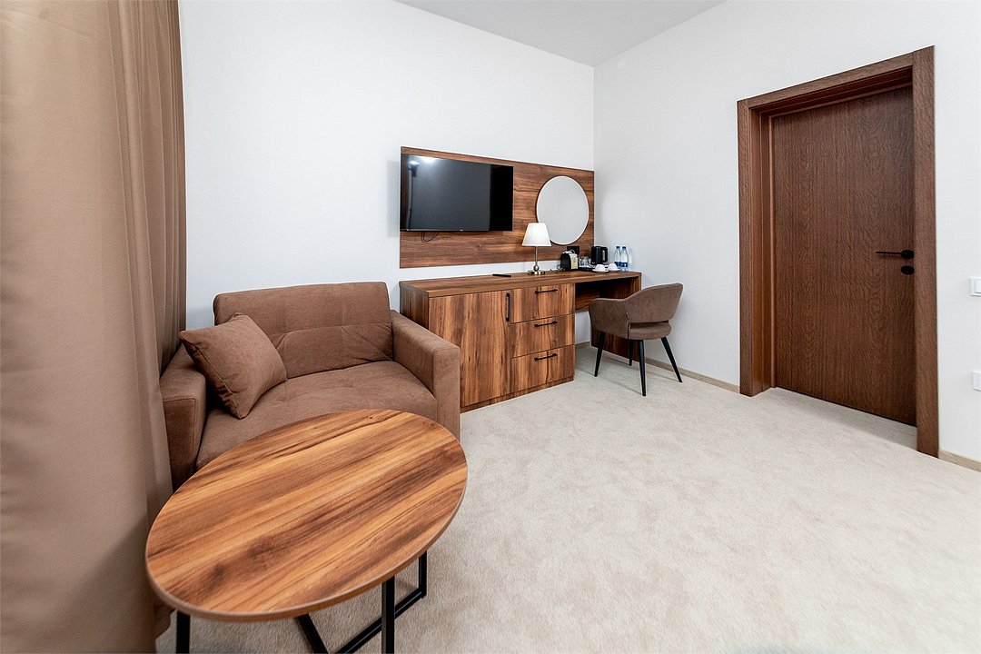 Джуниор Сьют Улучшенный – это однокомнатный номер повышенной комфортности и большей площади с просторной террасой. Отличный выбор для тех, кто ценит великолепие, уют и безмятежный отдых. Современный стиль сочетается с замечательными дизайнерскими решениями. Номер снабжен всеми атрибутами, которые помогут сделать пребывание в нем по-настоящему комфортным. Потрясающий вид с террасы на горные склоны принесет множество приятных минут, проведенных наедине с природой. Номер оснащен чайным набором, минеральной водой, махровыми халатами и тапочками.Услуги и удобства