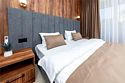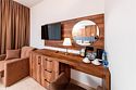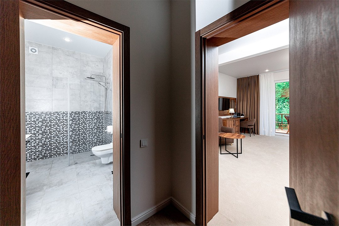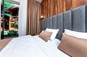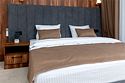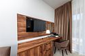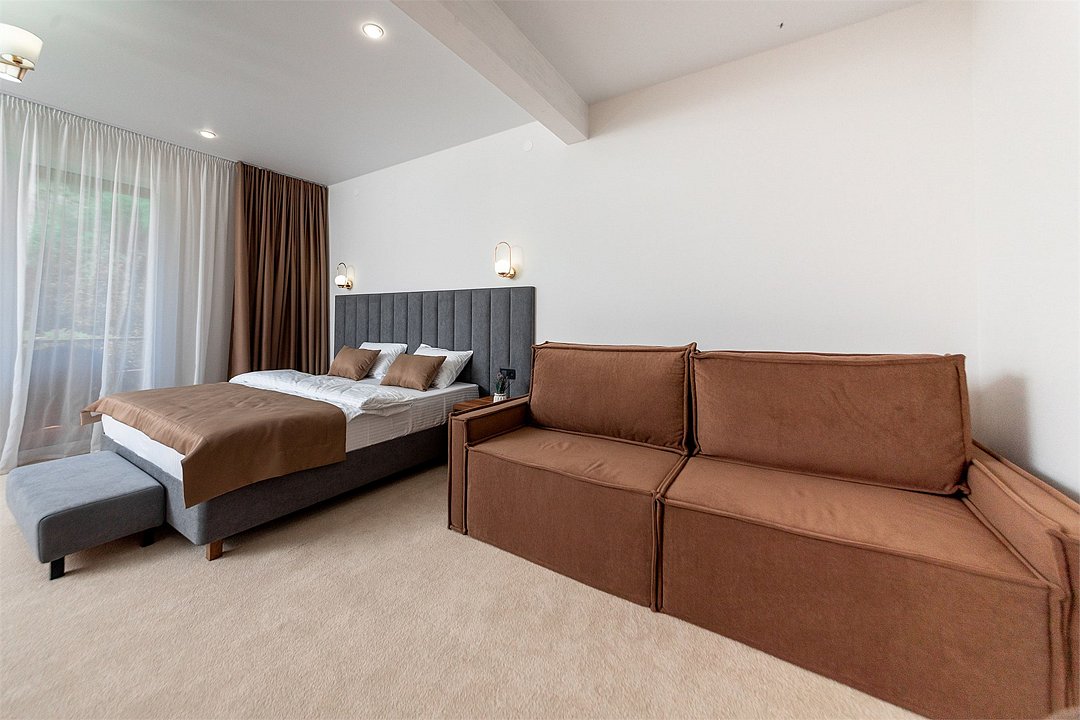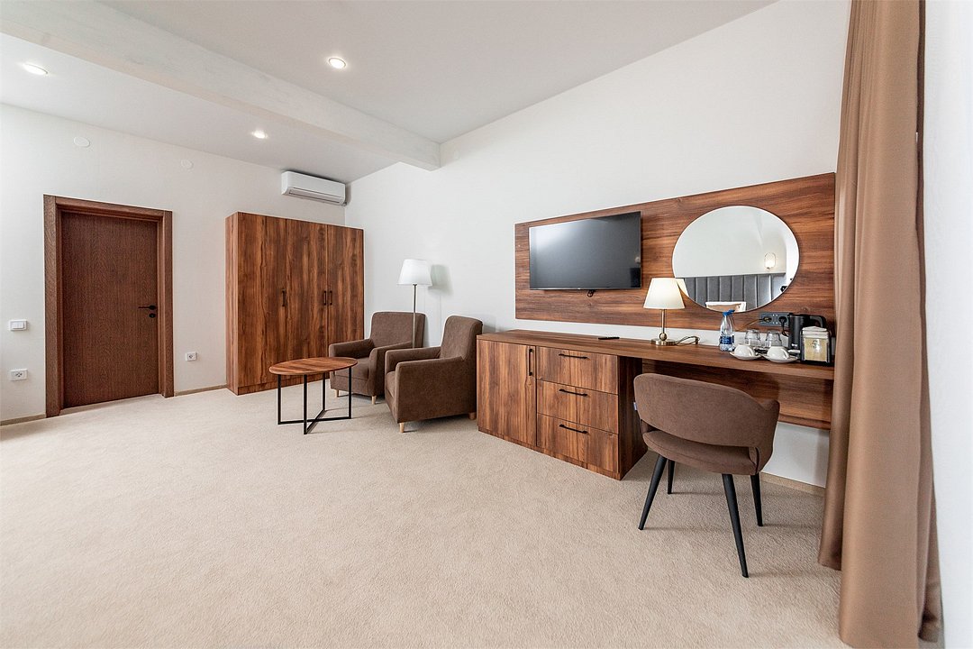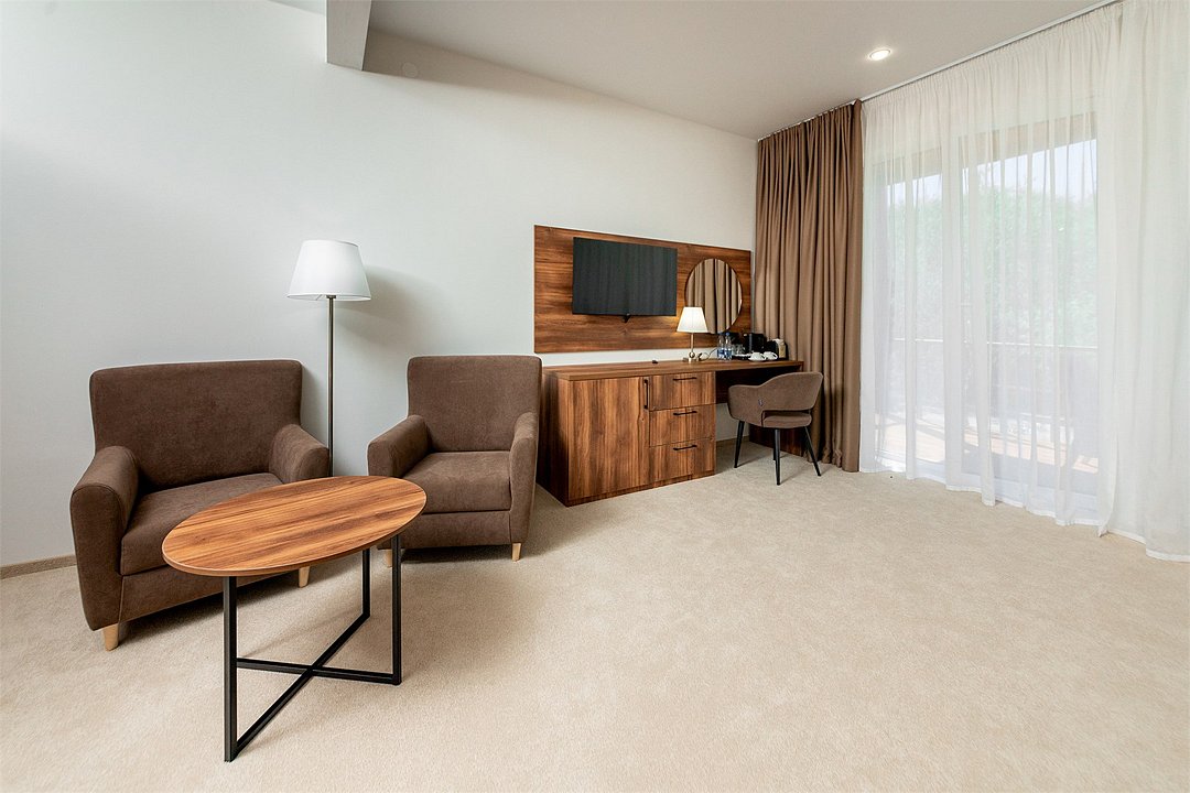 Джуниор Сьют Улучшенный – это однокомнатный номер повышенной комфортности и большей площади с просторной террасой. Отличный выбор для тех, кто ценит великолепие, уют и безмятежный отдых. Современный стиль сочетается с замечательными дизайнерскими решениями. Номер снабжен всеми атрибутами, которые помогут сделать пребывание в нем по-настоящему комфортным. Потрясающий вид с террасы на горные склоны принесет множество приятных минут, проведенных наедине с природой. Номер оснащен чайным набором, минеральной водой, махровыми халатами и тапочками.Услуги и удобства