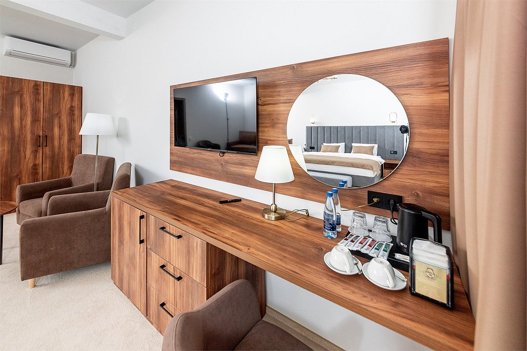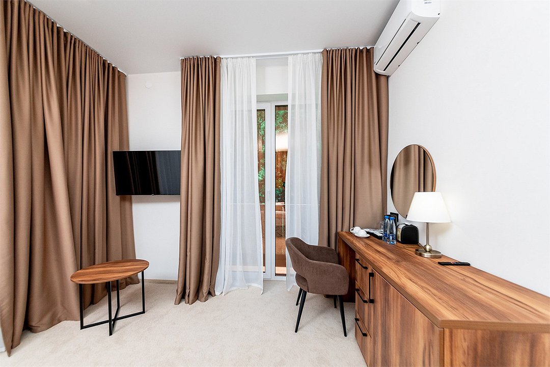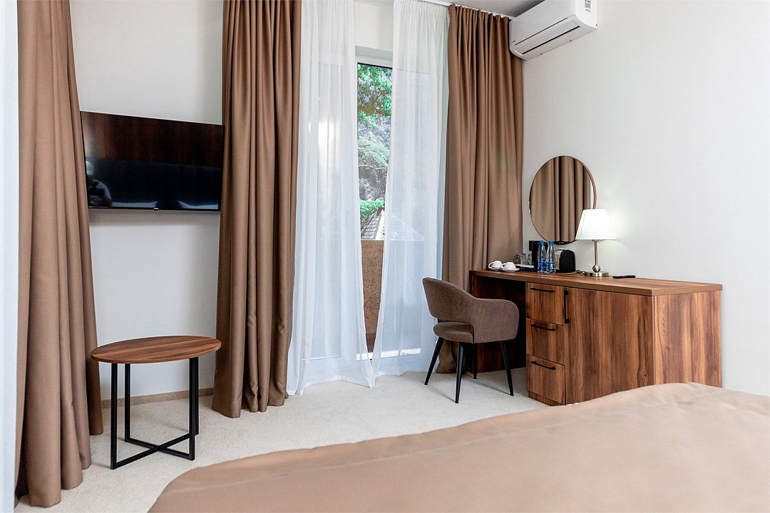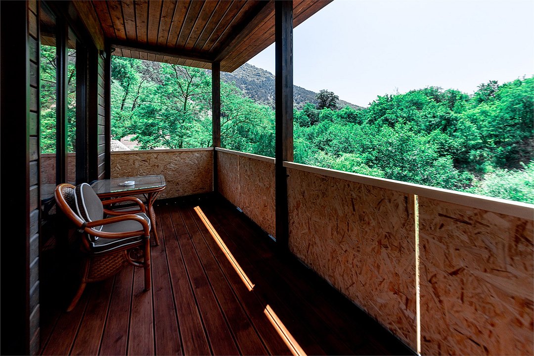 Уютный двухместный однокомнатный номер с кондиционером, выполненный в спокойной цветовой гамме располагает к отдыху после долгих экскурсий, прогулок и развлечений. В номере предусмотрена вся необходимая мебель: двуспальная кровать , стол со стульями , шкаф для одежды, банкетка. Номер оснащен всем необходимым для комфортного отдыха: холодильником, телевизором, бесплатным доступом к сети Интернет (WiFi), феном, кондиционером. Отличное соотношение "цена – качество" позволит вам за относительно небольшие деньги получить максимум комфорта и удобств. Просторная терраса, укомплектованная летней мебелью позволит насладиться свежим горным воздухом и приятно провести время.Услуги и удобства