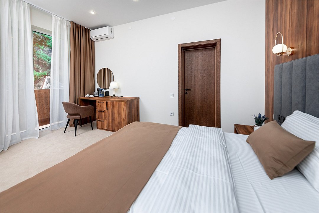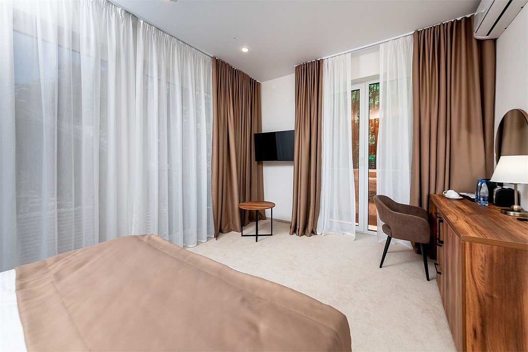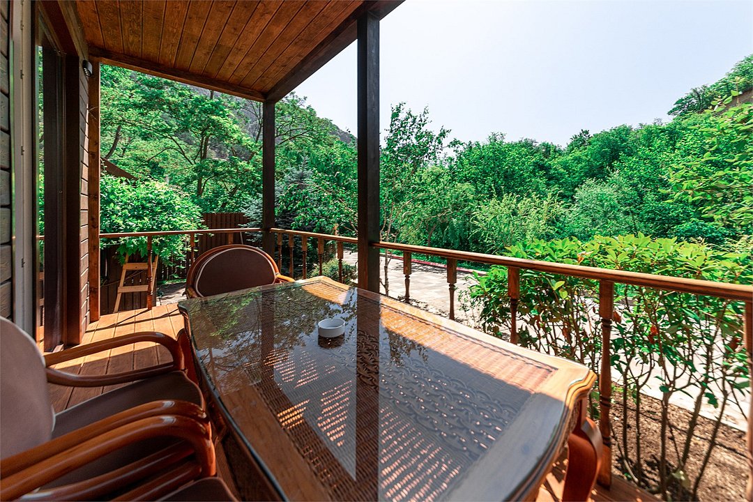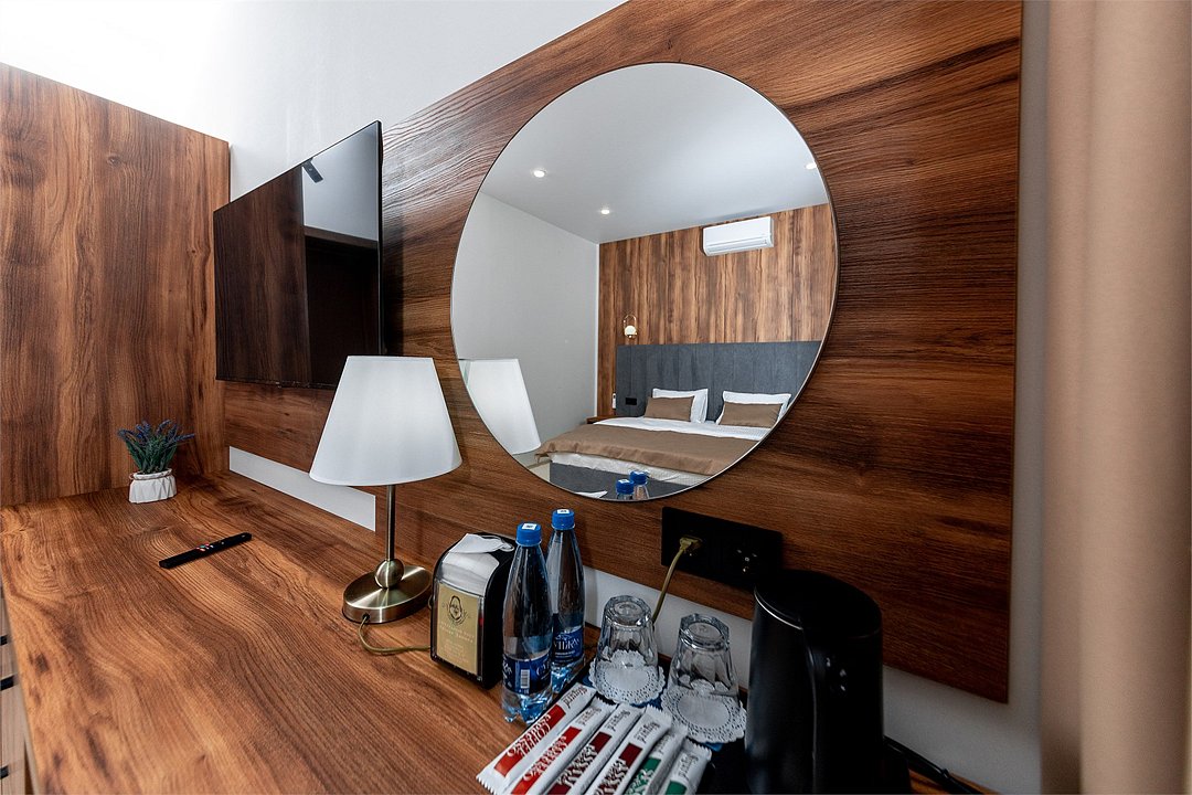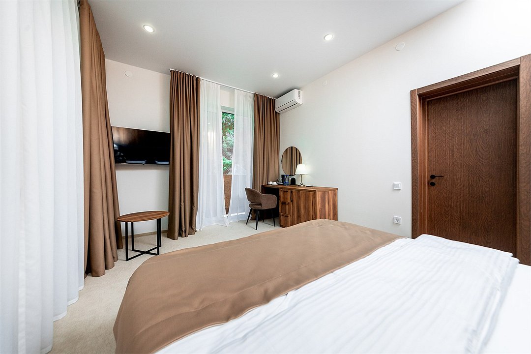 Уютный двухместный однокомнатный номер с кондиционером, выполненный в спокойной цветовой гамме располагает к отдыху после долгих экскурсий, прогулок и развлечений. В номере предусмотрена вся необходимая мебель: двуспальная кровать , стол со стульями , шкаф для одежды, банкетка. Номер оснащен всем необходимым для комфортного отдыха: холодильником, телевизором, бесплатным доступом к сети Интернет (WiFi), феном, кондиционером. Отличное соотношение "цена – качество" позволит вам за относительно небольшие деньги получить максимум комфорта и удобств. Просторная терраса, укомплектованная летней мебелью позволит насладиться свежим горным воздухом и приятно провести время.Услуги и удобства