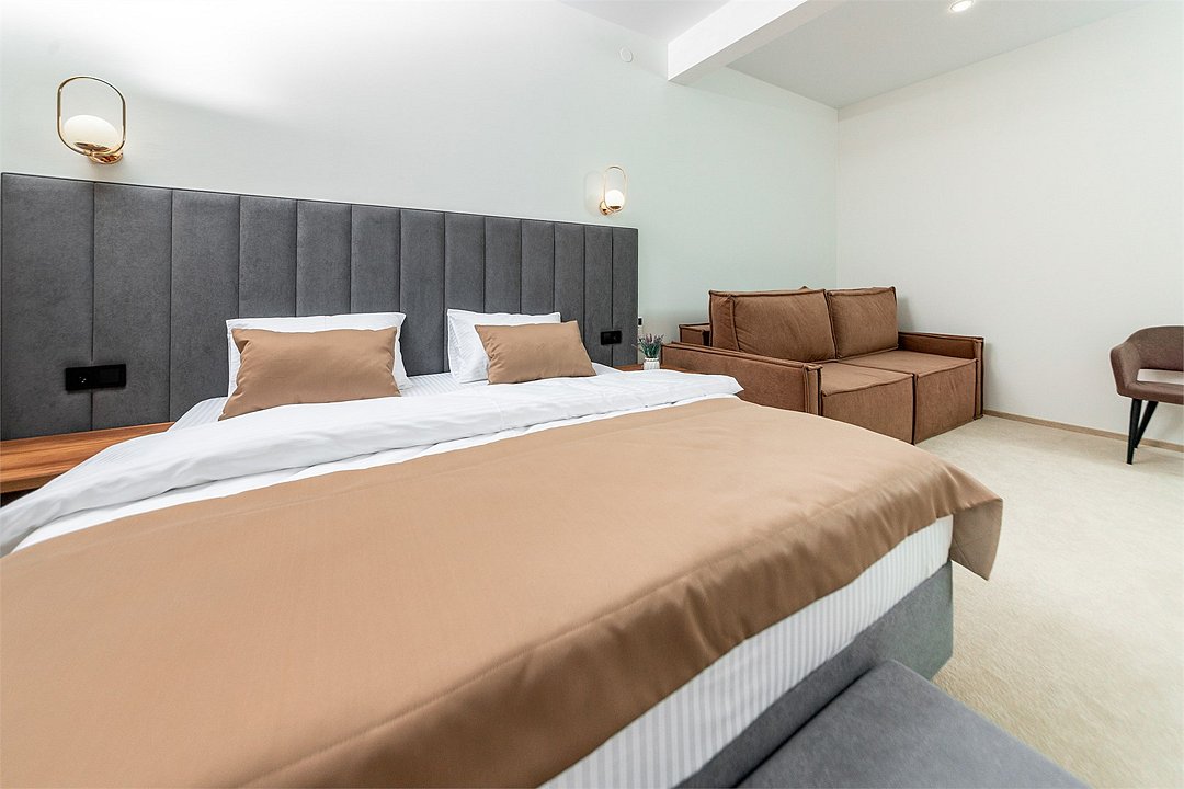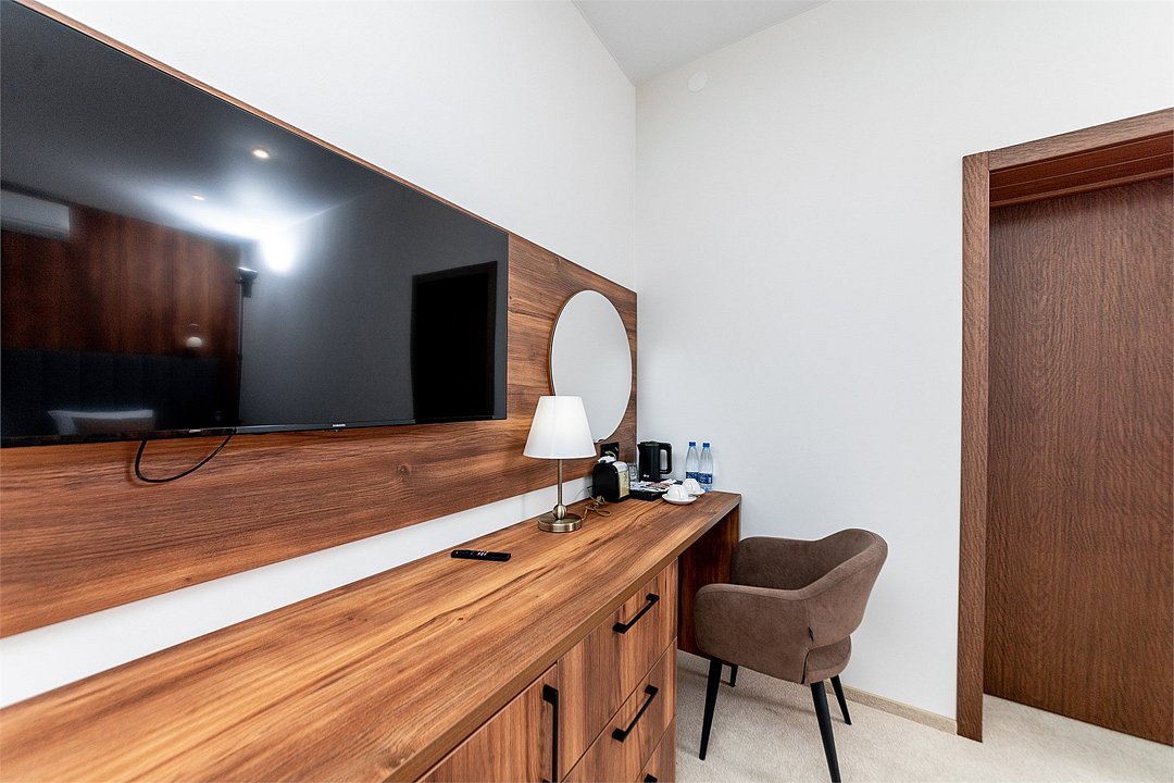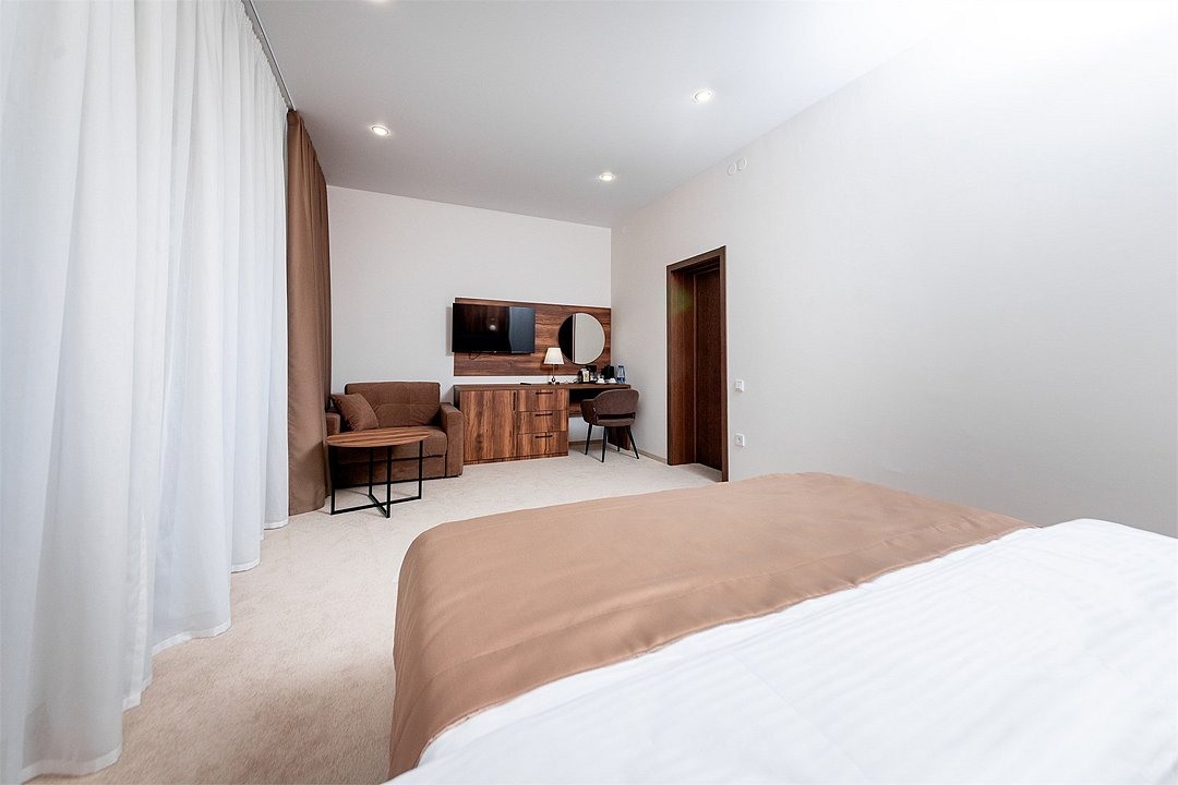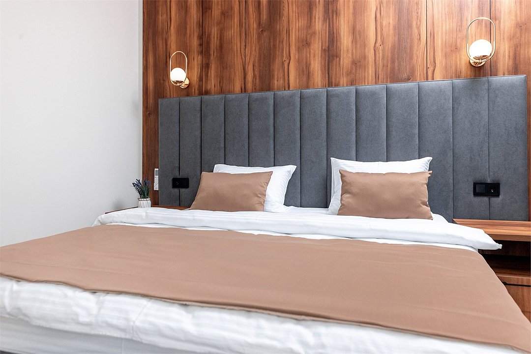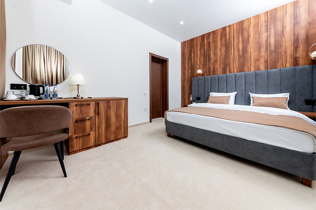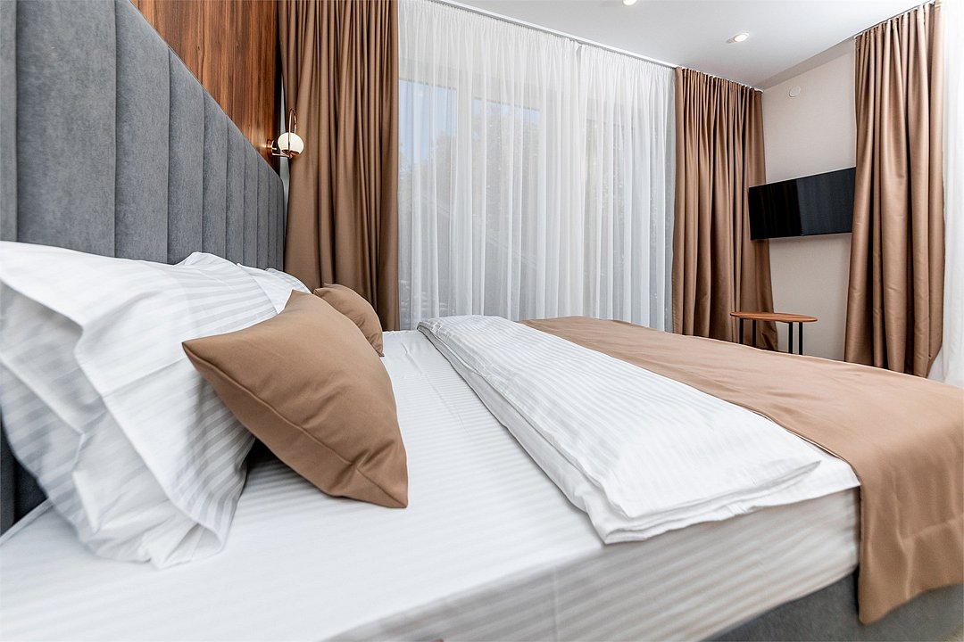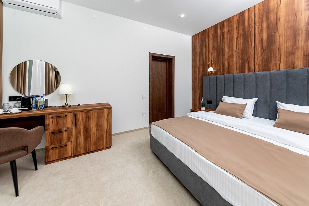 Дизайн нового номера категории "Комфорт" выгодно отличает его от стандартных номеров. Все номера «Комфорт» укомплектованы мебелью, предназначенной для полноценного отдыха. Жилая площадь двухместных номеров "Комфорт" составляет 25 м2. Спальная зона представлена одной двуспальной кроватью, укомплектована ортопедическим матрасом и прикроватными тумбами для размещения личных вещей гостей. Дополнительное место в виде раскладного дивана-кровати. В каждом номере есть широкоформатный жидкокристаллический телевизор с подключением к кабельному ТВ и большим количеством каналов в хорошем качестве. Во всех номерах установлены мощные кондиционеры и холодильники. Обеденный стол со стульями. Хранение личных дорогостоящих и ценных вещей можно доверить сейфу с надежным электронным замком. Высокоскоростное подключение к сети интернет через канал Wi-Fi. Душевая комплектуется индивидуальным комплектом банных полотенец, халатов, удобных тапочек, феном, и расширенным набором косметических средств. Год реконструкции - 2023гУслуги и удобства