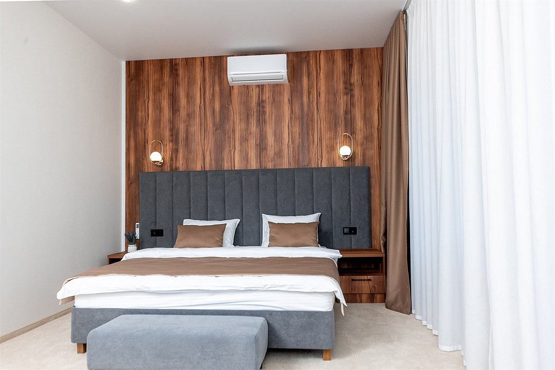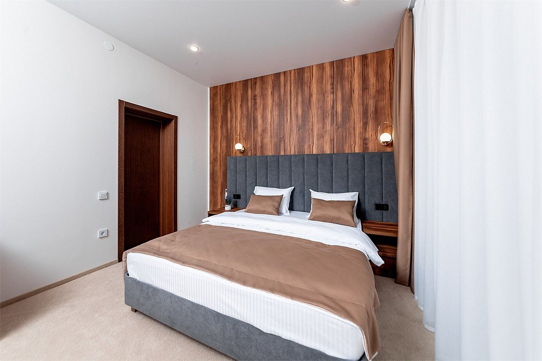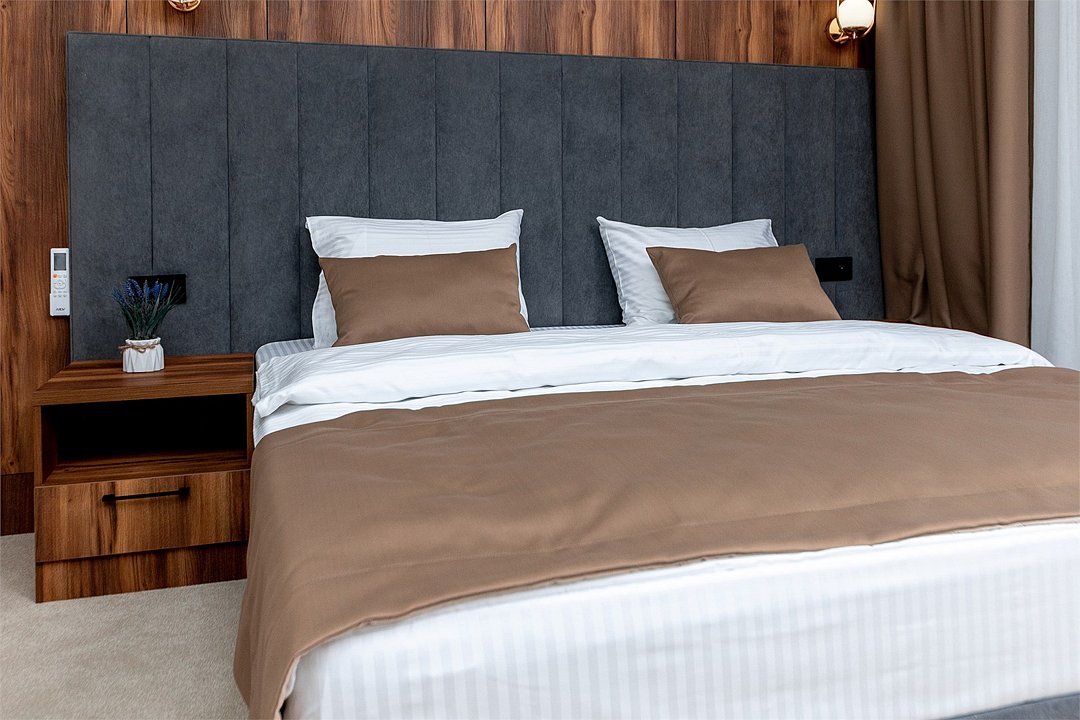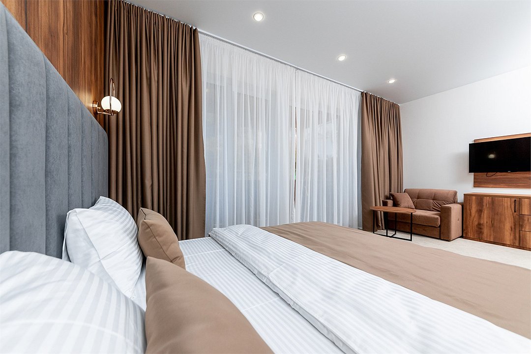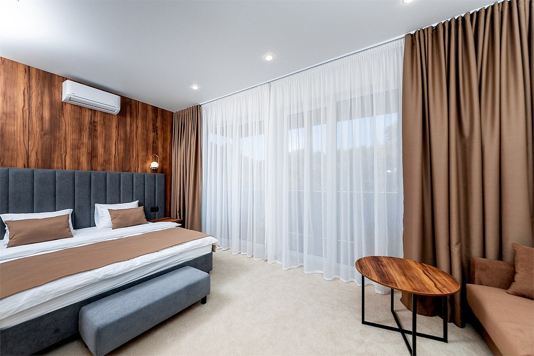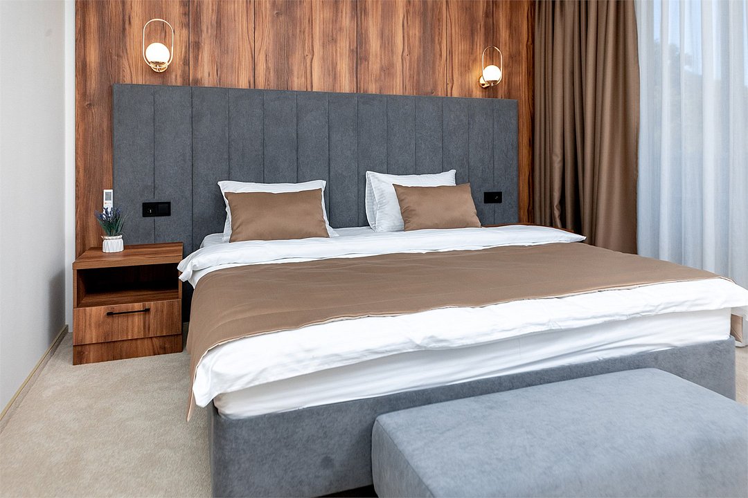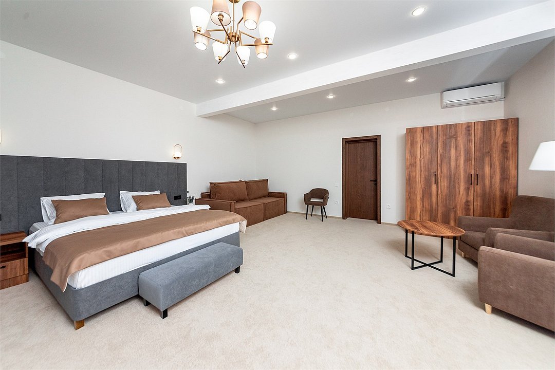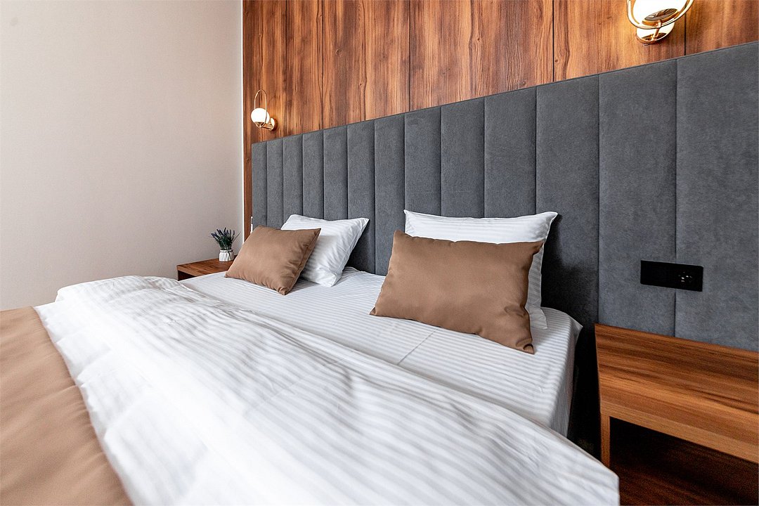 Дизайн нового номера категории "Комфорт" выгодно отличает его от стандартных номеров. Все номера «Комфорт» укомплектованы мебелью, предназначенной для полноценного отдыха. Жилая площадь двухместных номеров "Комфорт" составляет 25 м2. Спальная зона представлена одной двуспальной кроватью, укомплектована ортопедическим матрасом и прикроватными тумбами для размещения личных вещей гостей. Дополнительное место в виде раскладного дивана-кровати. В каждом номере есть широкоформатный жидкокристаллический телевизор с подключением к кабельному ТВ и большим количеством каналов в хорошем качестве. Во всех номерах установлены мощные кондиционеры и холодильники. Обеденный стол со стульями. Хранение личных дорогостоящих и ценных вещей можно доверить сейфу с надежным электронным замком. Высокоскоростное подключение к сети интернет через канал Wi-Fi. Душевая комплектуется индивидуальным комплектом банных полотенец, халатов, удобных тапочек, феном, и расширенным набором косметических средств. Год реконструкции - 2023гУслуги и удобства