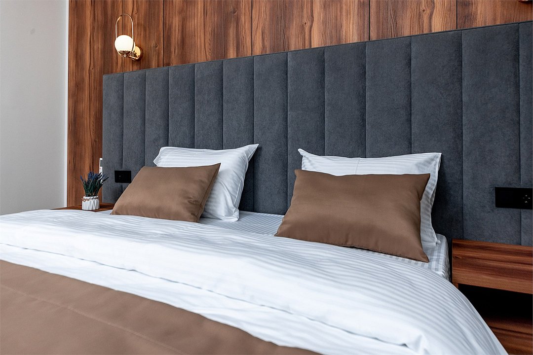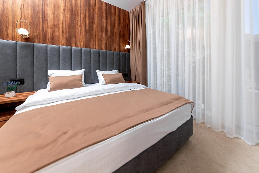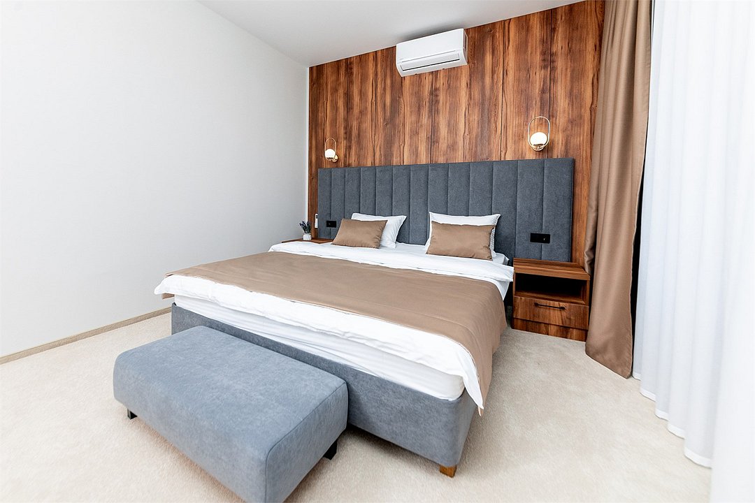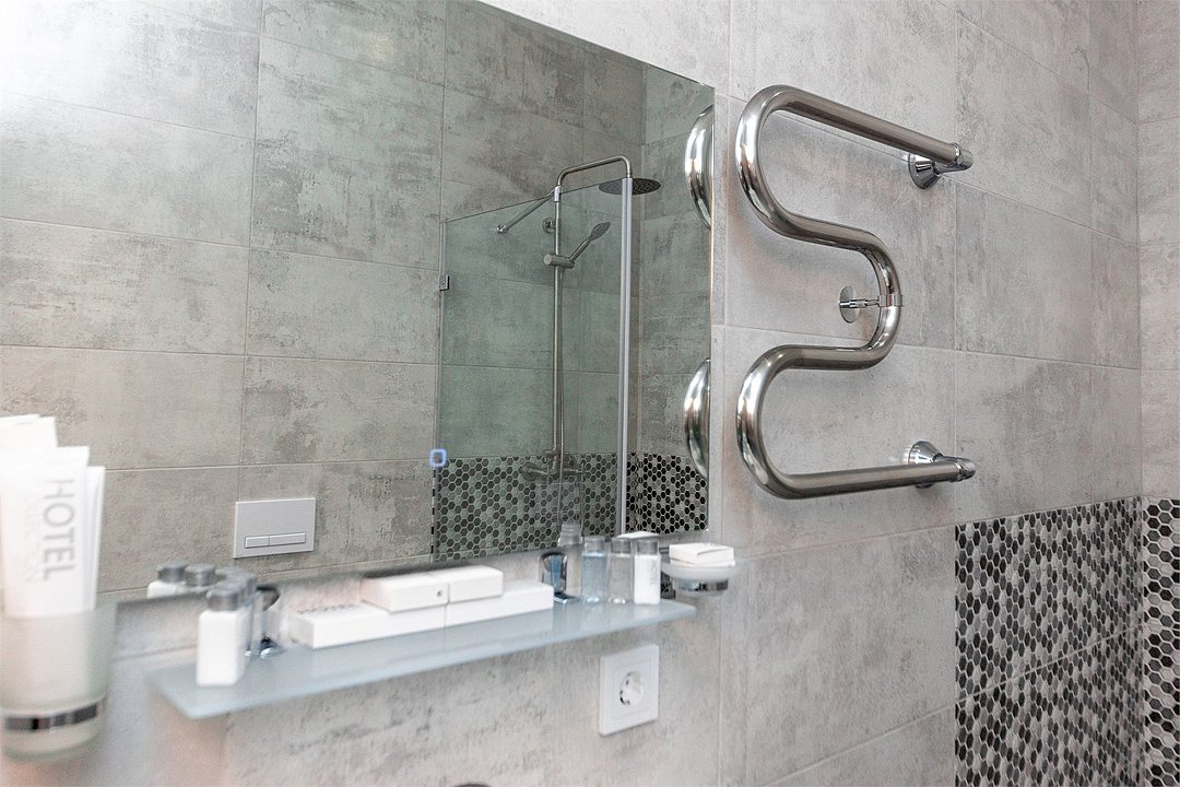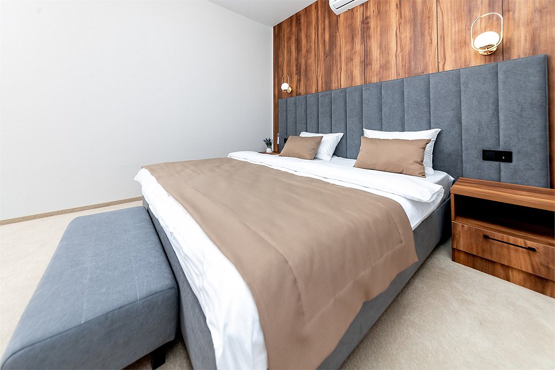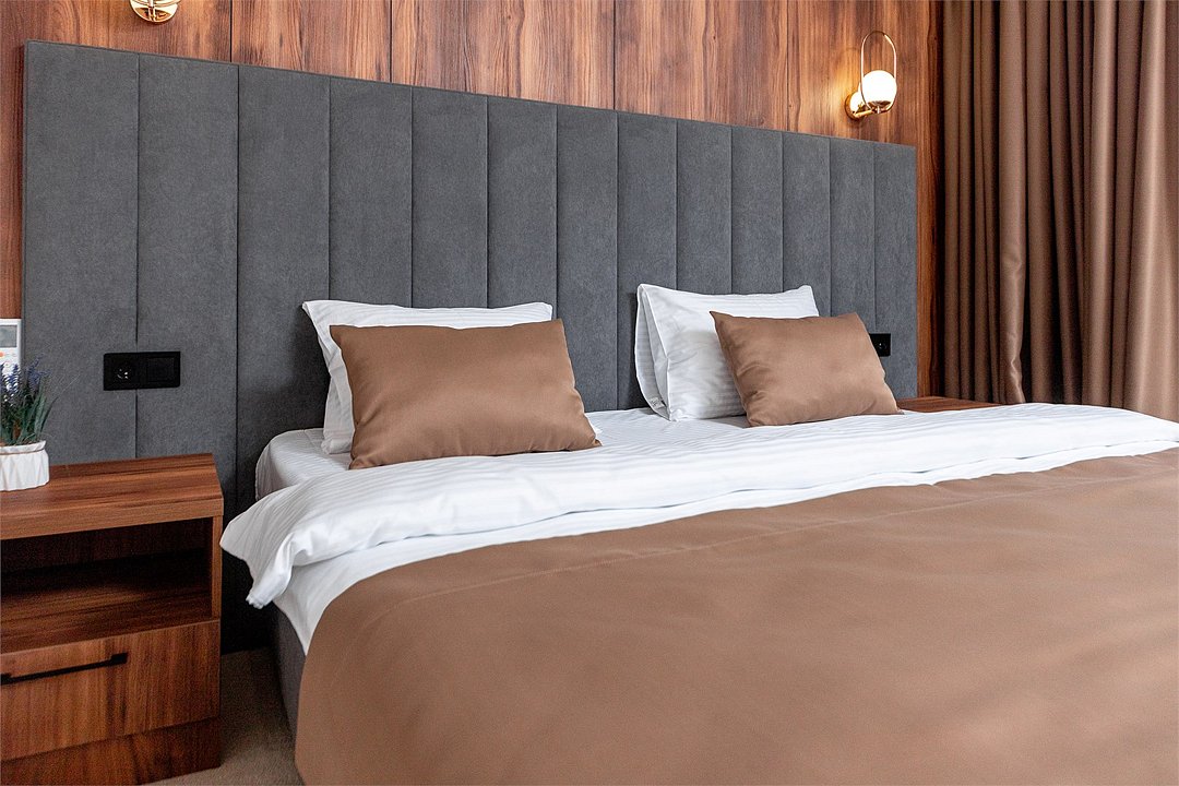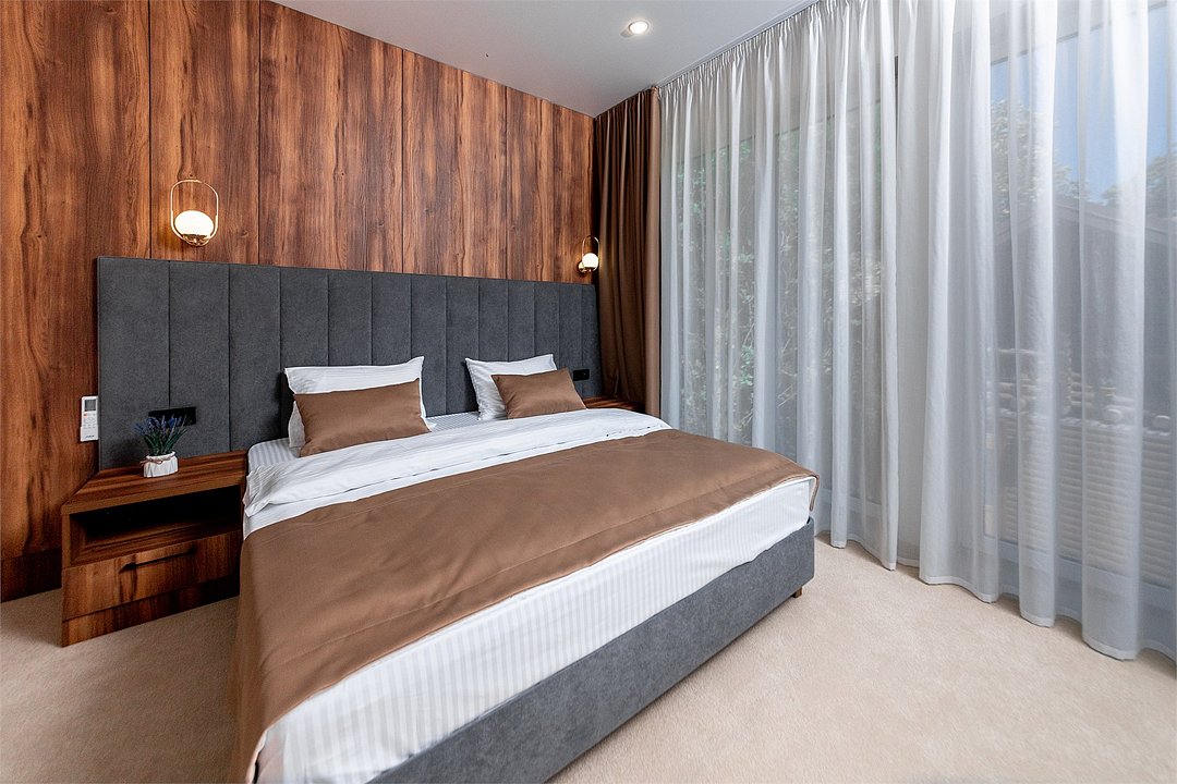 Дизайн нового номера категории "Комфорт" выгодно отличает его от стандартных номеров. Все номера «Комфорт» укомплектованы мебелью, предназначенной для полноценного отдыха. Жилая площадь двухместных номеров "Комфорт" составляет 25 м2. Спальная зона представлена одной двуспальной кроватью, укомплектована ортопедическим матрасом и прикроватными тумбами для размещения личных вещей гостей. Дополнительное место в виде раскладного дивана-кровати. В каждом номере есть широкоформатный жидкокристаллический телевизор с подключением к кабельному ТВ и большим количеством каналов в хорошем качестве. Во всех номерах установлены мощные кондиционеры и холодильники. Обеденный стол со стульями. Хранение личных дорогостоящих и ценных вещей можно доверить сейфу с надежным электронным замком. Высокоскоростное подключение к сети интернет через канал Wi-Fi. Душевая комплектуется индивидуальным комплектом банных полотенец, халатов, удобных тапочек, феном, и расширенным набором косметических средств. Год реконструкции - 2023гУслуги и удобства
