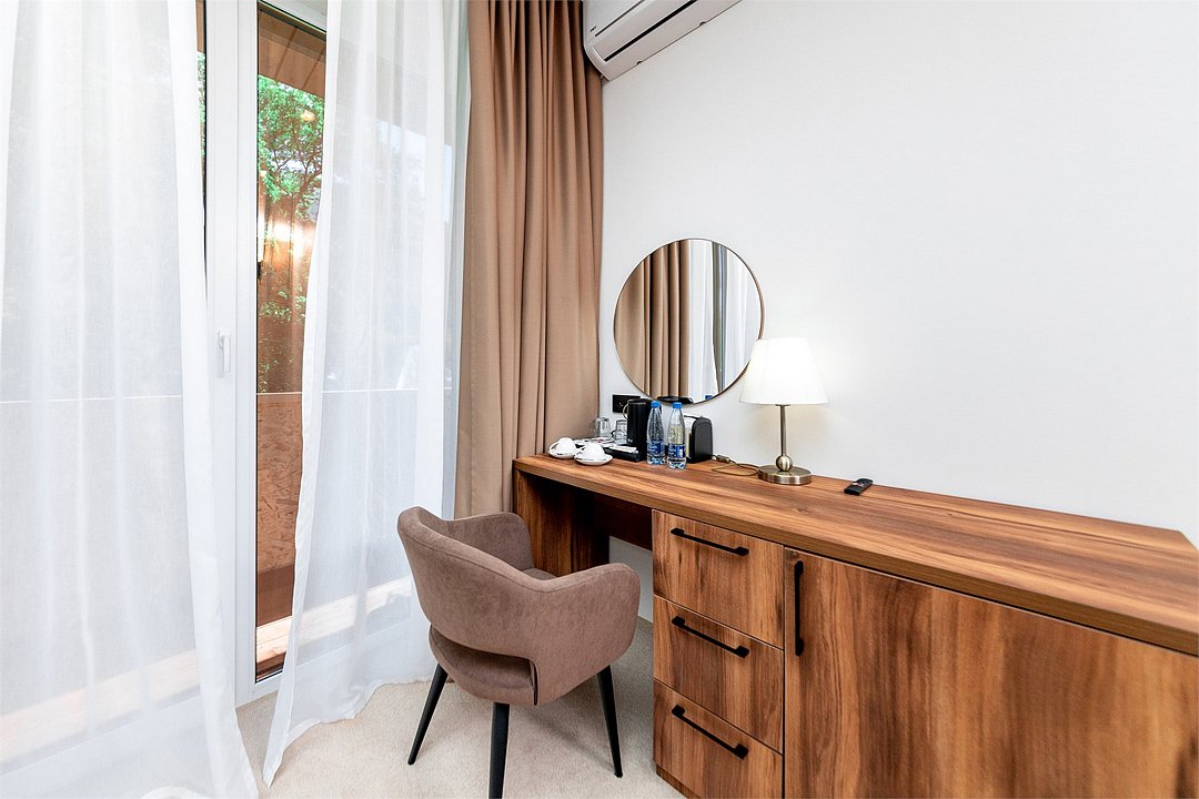 телевизор, Wi-Fi, интернет, кондиционер, фен, утюг, ванная комната, душевая кабина, гигиенические средства, терраса, двуспальная кровать, шкаф для одежды, вешалки, зеркало, чайный набор, сейф, минеральная вода, чайник, унитаз, питьевая вода, отопление, отдельный вход в номер, ламинат, стаканы, туалетные средства, цифровое тв, внутренний телефон, мини-холодильник, общественный бассейн, онлайн-регистрация до заезда, чайная станция, набор для приготовления чая и кофе, без питомцевВ номере