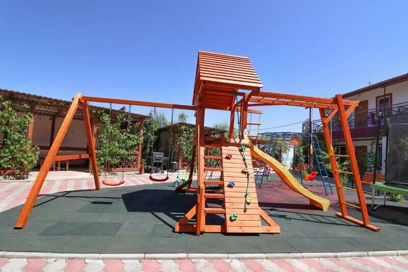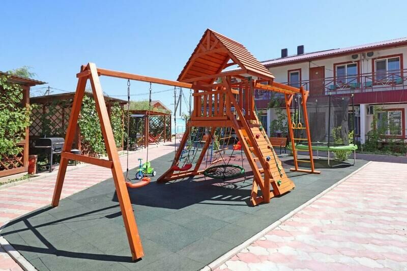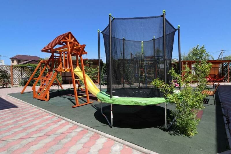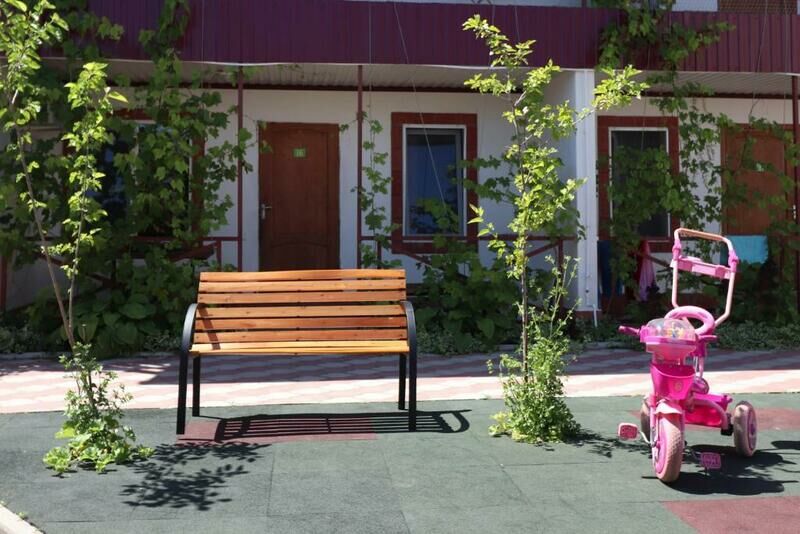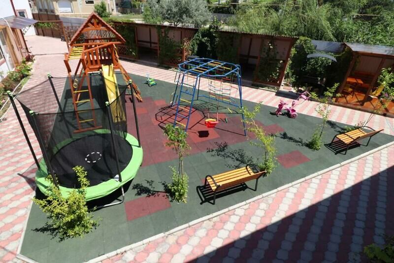 Территория гостиницы закрытая, ухоженная (с газонами и дорожками из тротуарной литки), на воротах - кодовый замок, детская площадка (качели, спортивный комплекс, горка, батут, песочница), парковка, беседки со столами и скамейками, мангал, общая кухня, бесплатный Wi-Fi.