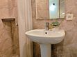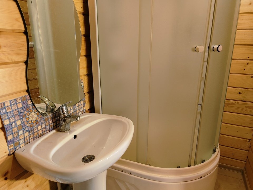 Ванная комната: душ, унитаз, раковина, туалетные принадлежности.