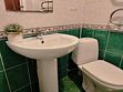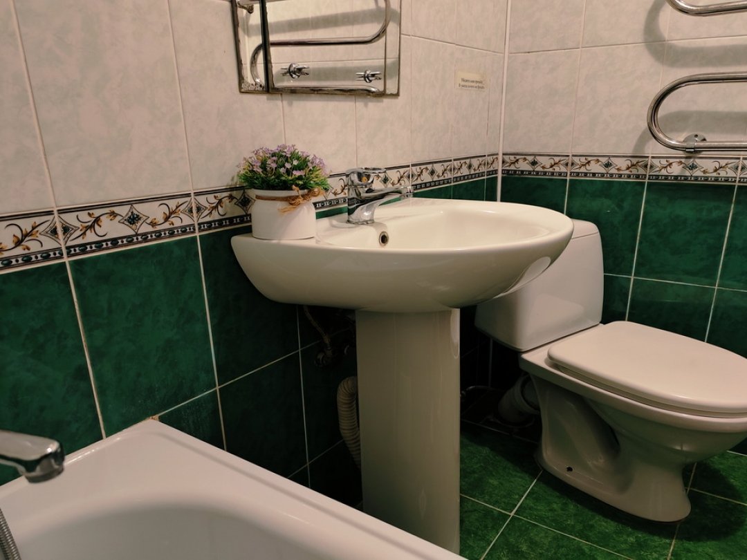 Ванная комната: ванна, унитаз, раковина, туалетные принадлежности.