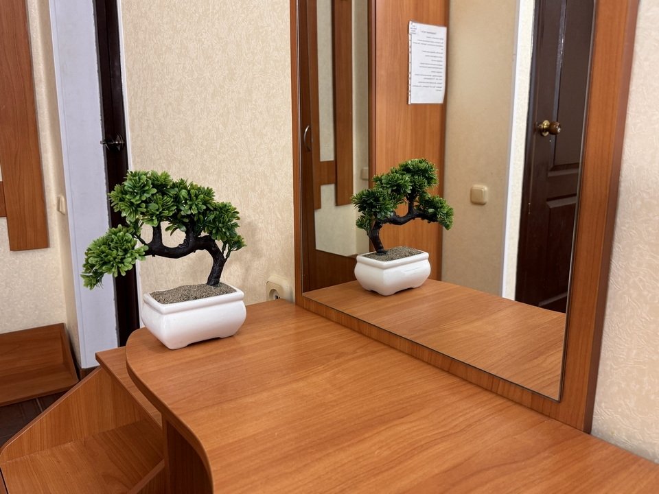 Двухспальная кровать 1.40 м или две кровати 80 см, шкаф, трюмо, зеркало, прикроватная тумбочка, телевизор, кондиционер, мини-холодильник.