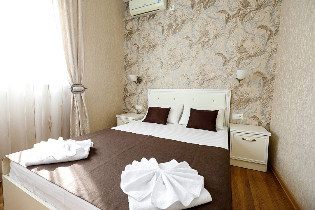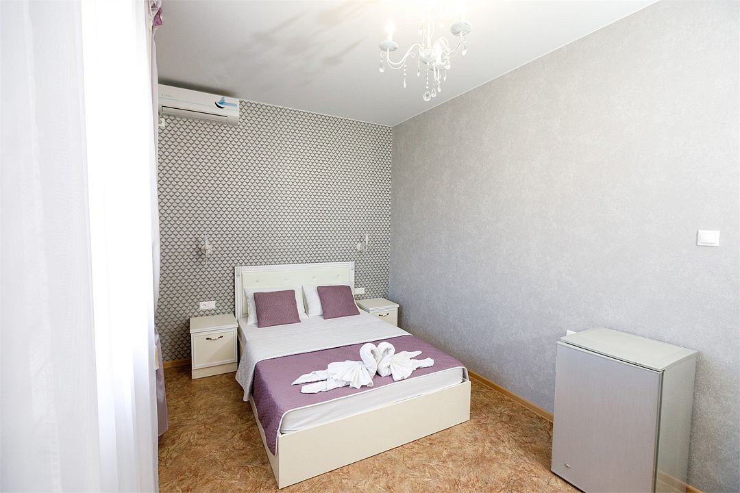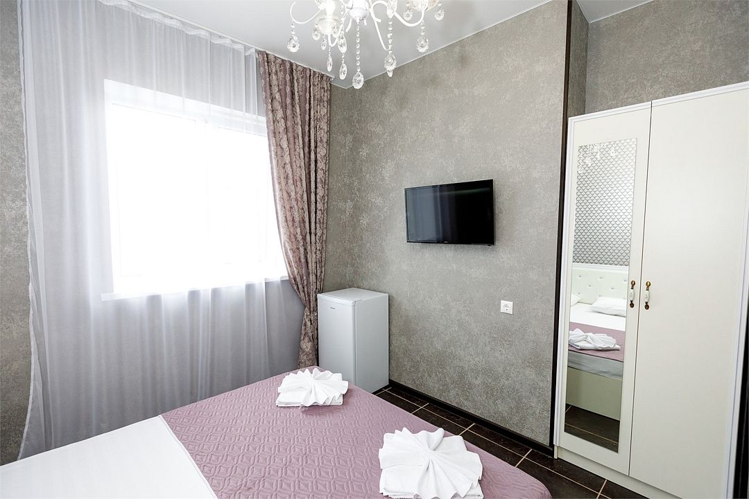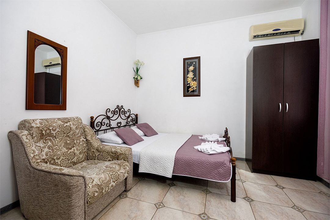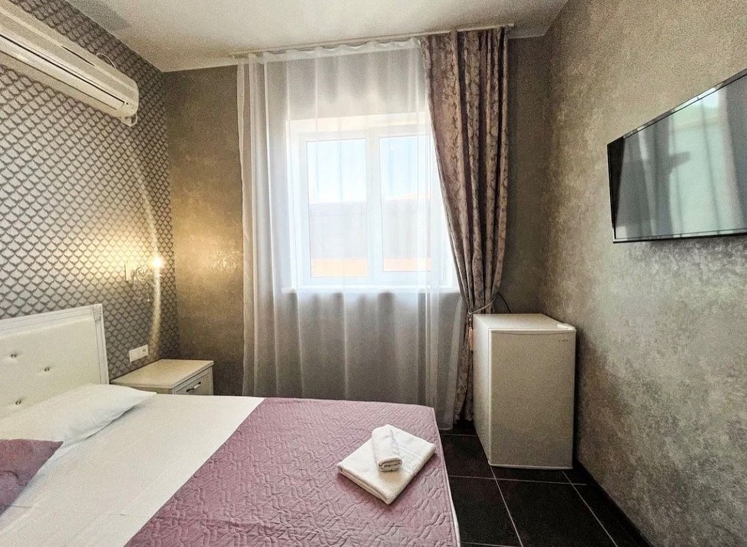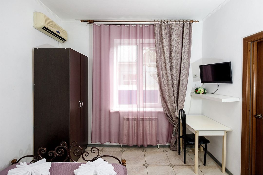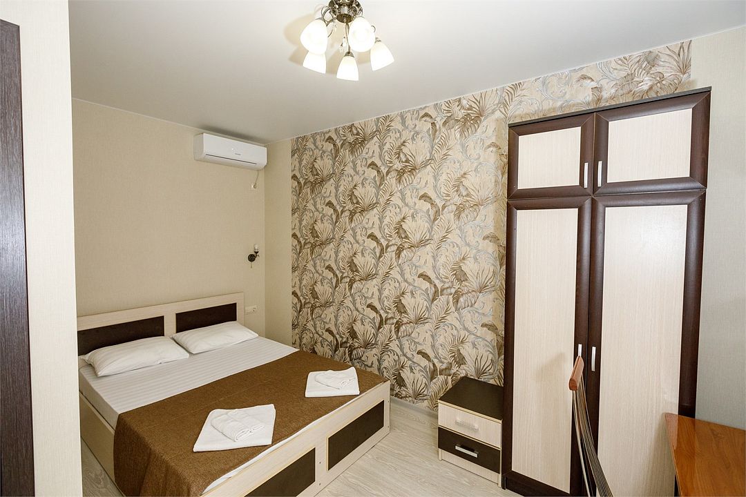 Wi-Fi, холодильник, кондиционер, фен, ванна, банные полотенца, двуспальная кровать, тумбы, шкаф для одежды, вешалки, письменный стол, зеркало, обслуживание номеров, раковина, отдельный вход в номер, вид во двор, стул, туалетные средства, туалет, телевизор с плоским экраном, москитная сеткаВ гостиничном номере