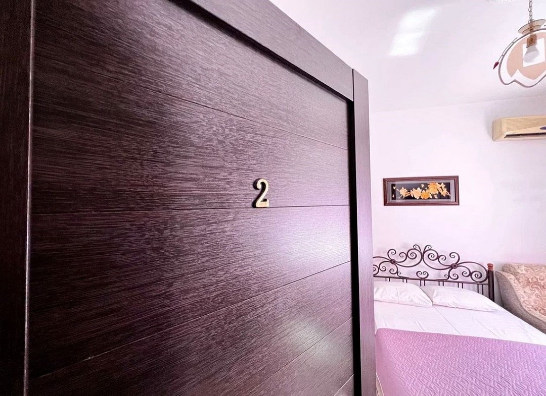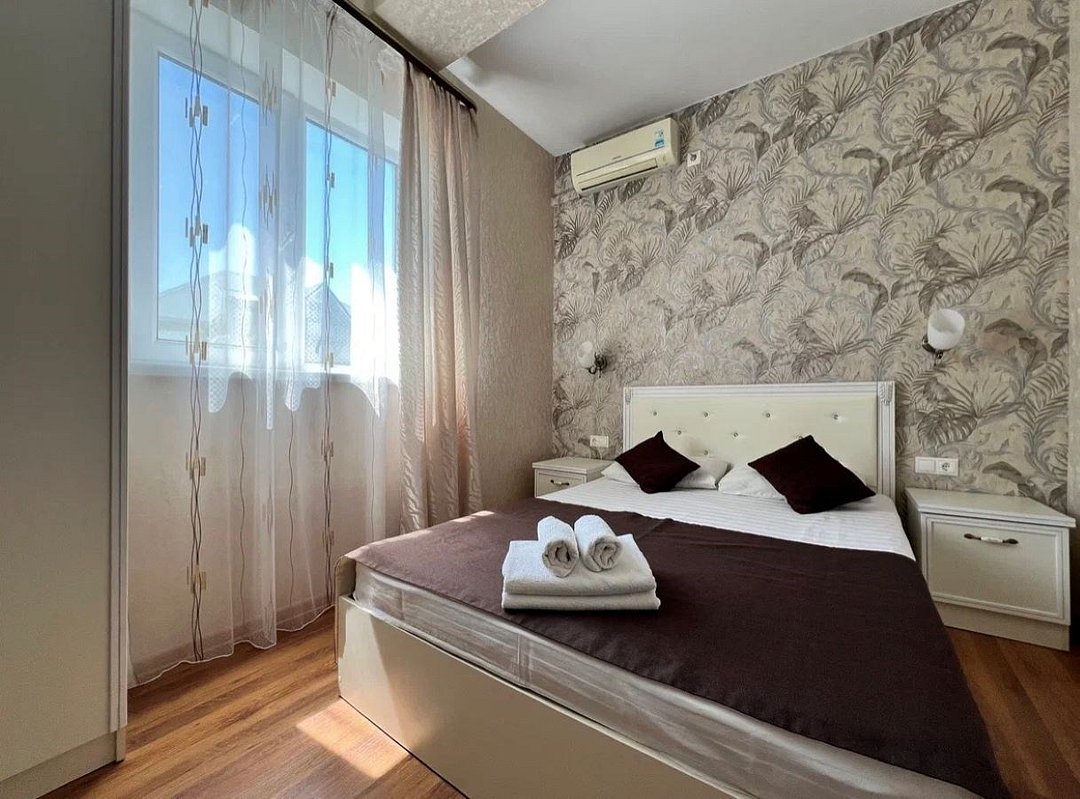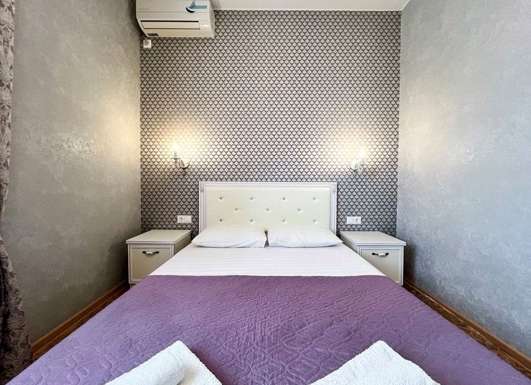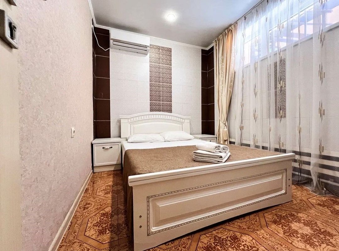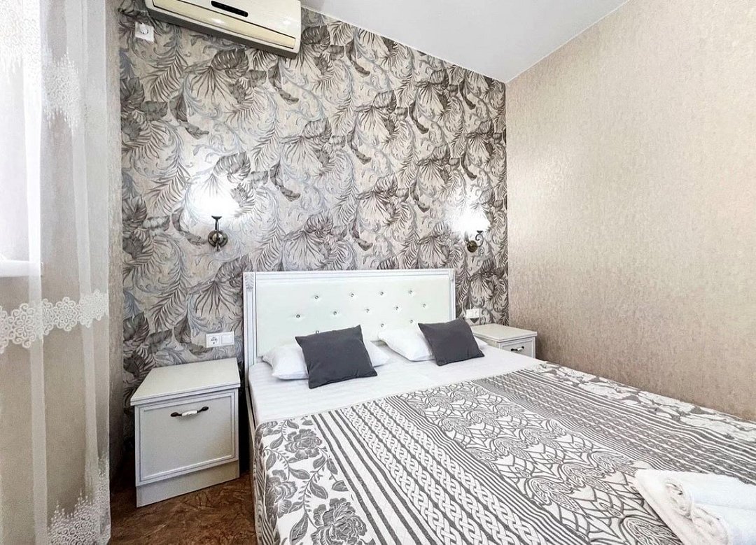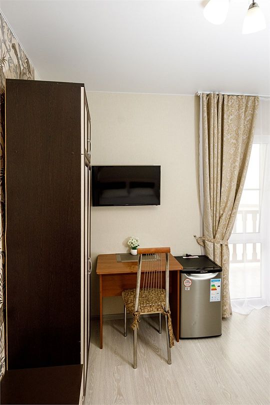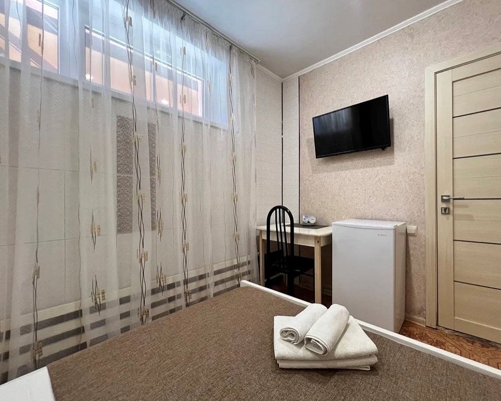 Wi-Fi, холодильник, кондиционер, фен, ванна, банные полотенца, двуспальная кровать, тумбы, шкаф для одежды, вешалки, письменный стол, зеркало, обслуживание номеров, раковина, отдельный вход в номер, вид во двор, стул, туалетные средства, туалет, телевизор с плоским экраном, москитная сеткаВ гостиничном номере