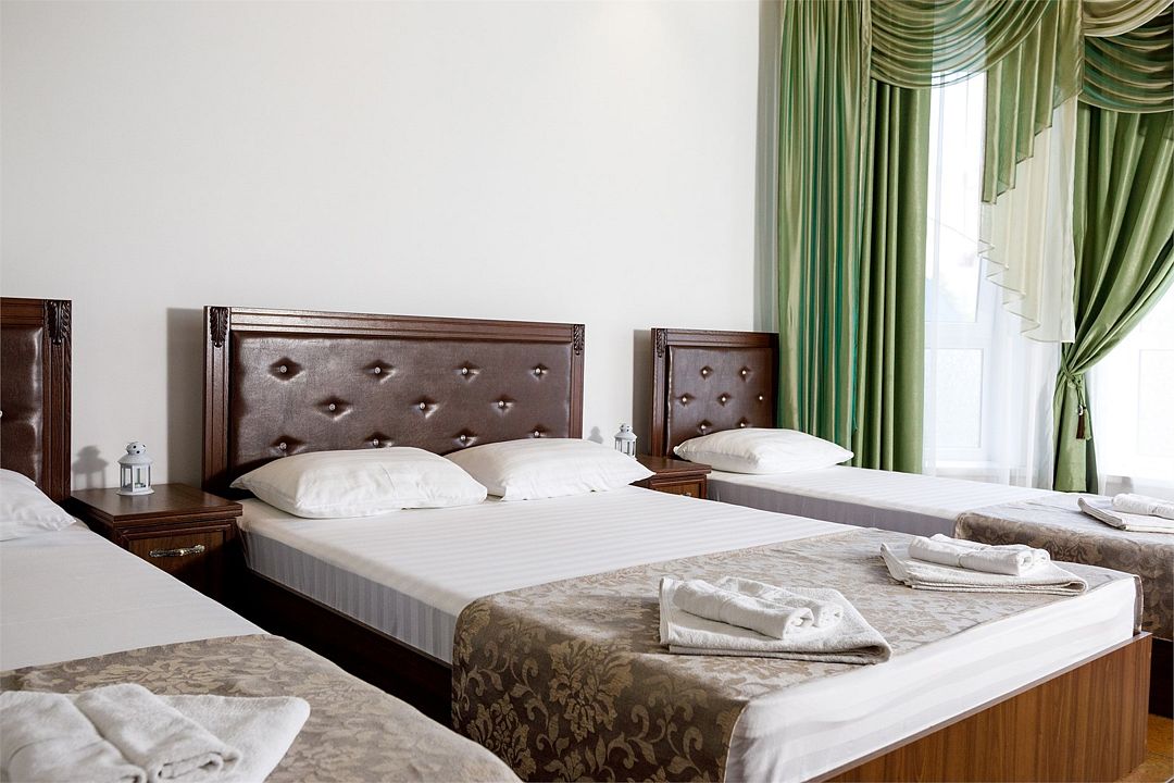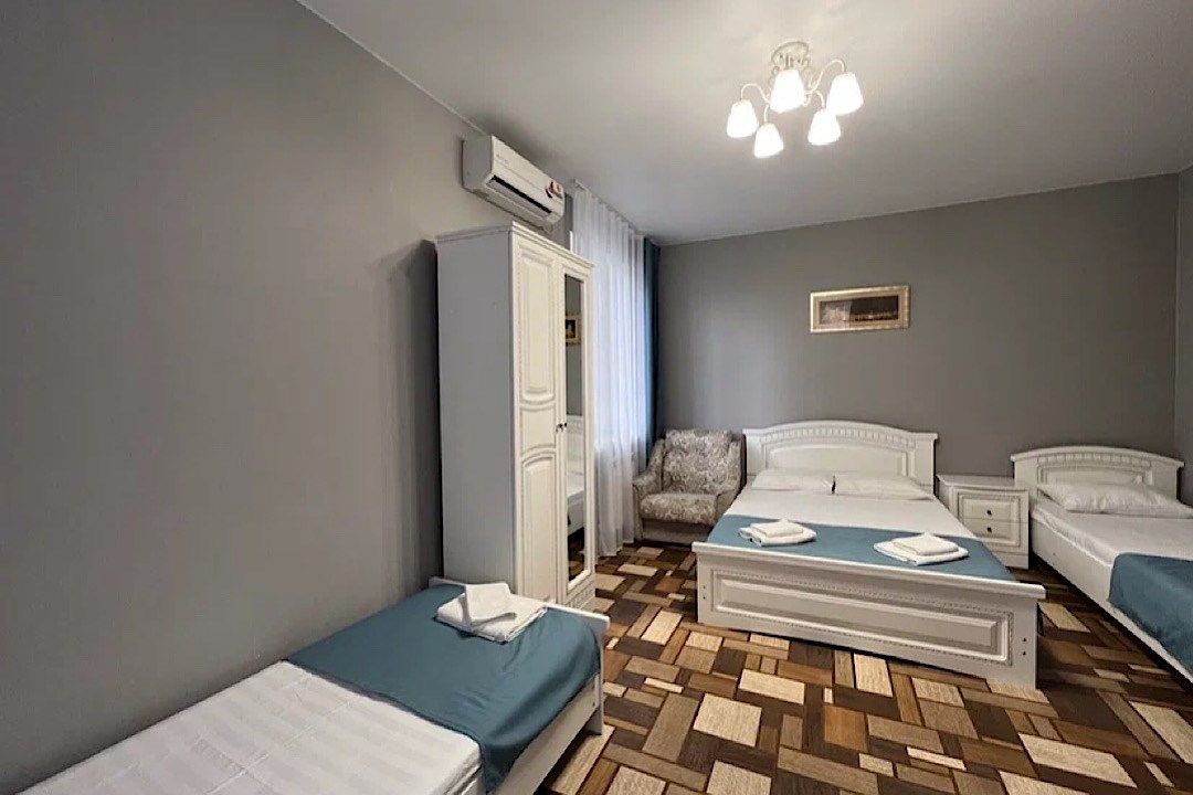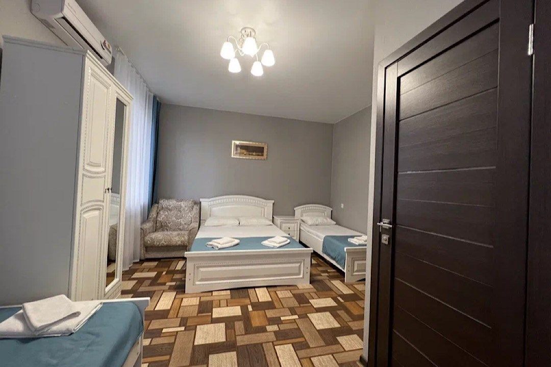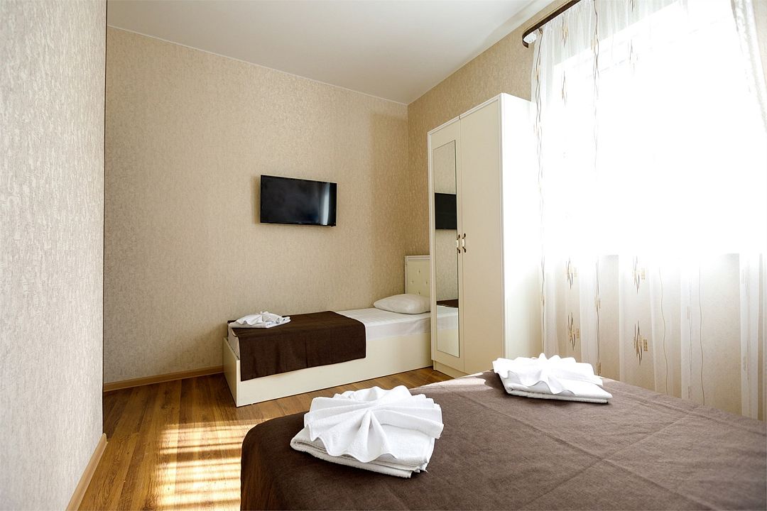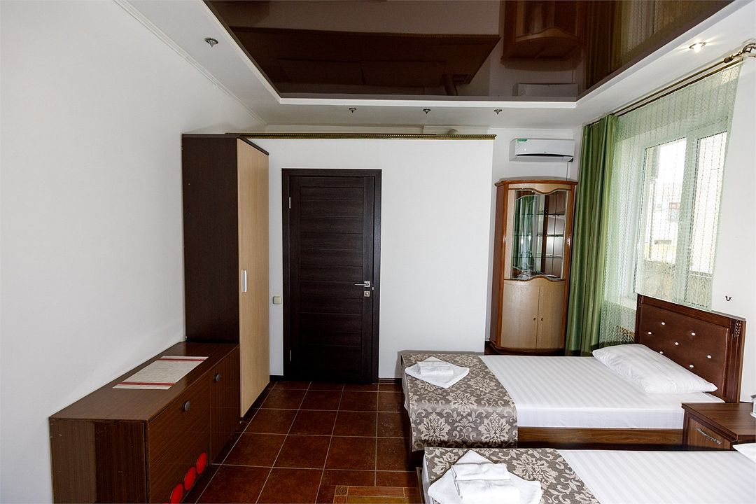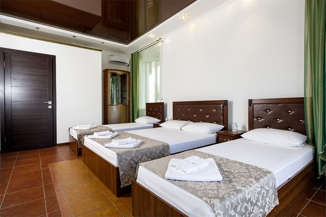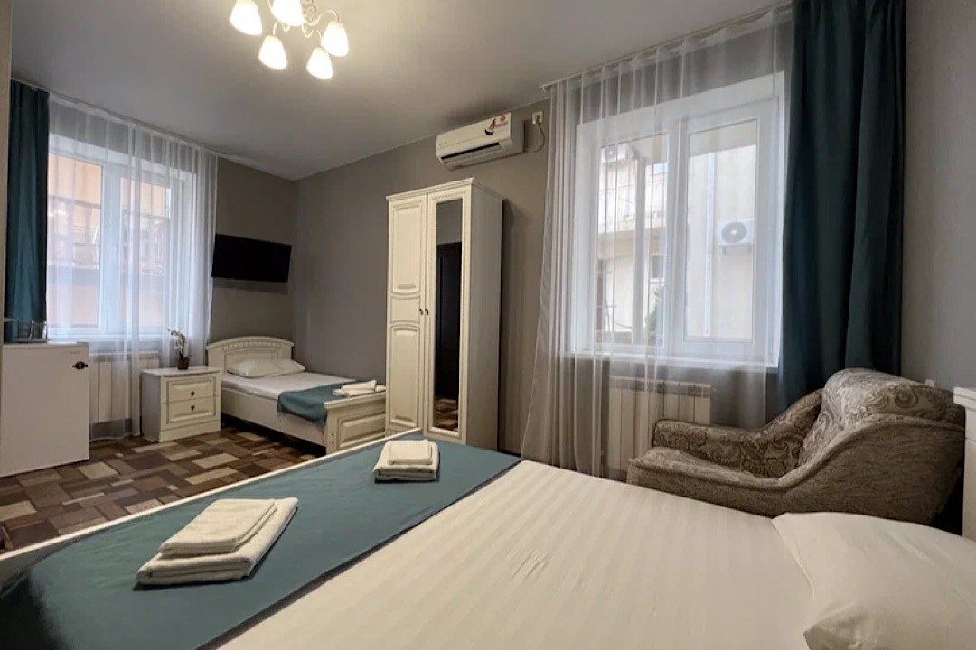 Wi-Fi, холодильник, кондиционер, фен, ванна, банные полотенца, двуспальная кровать, две односпальные кровати, шкаф для одежды, вешалки, журнальный столик, зеркало, пуфики, душ, вид во двор, тумба, туалетные средства, телевизор с плоским экраномВ гостиничном номере