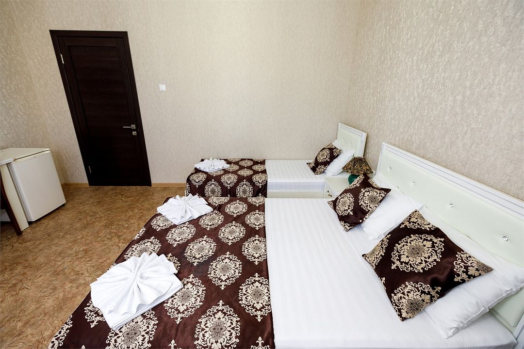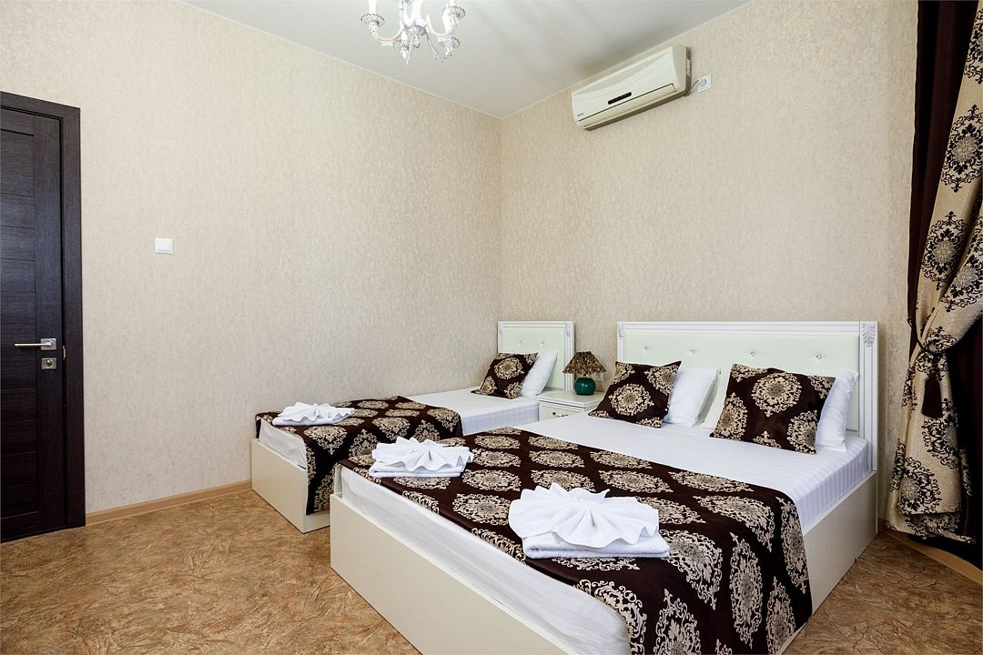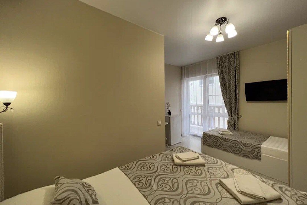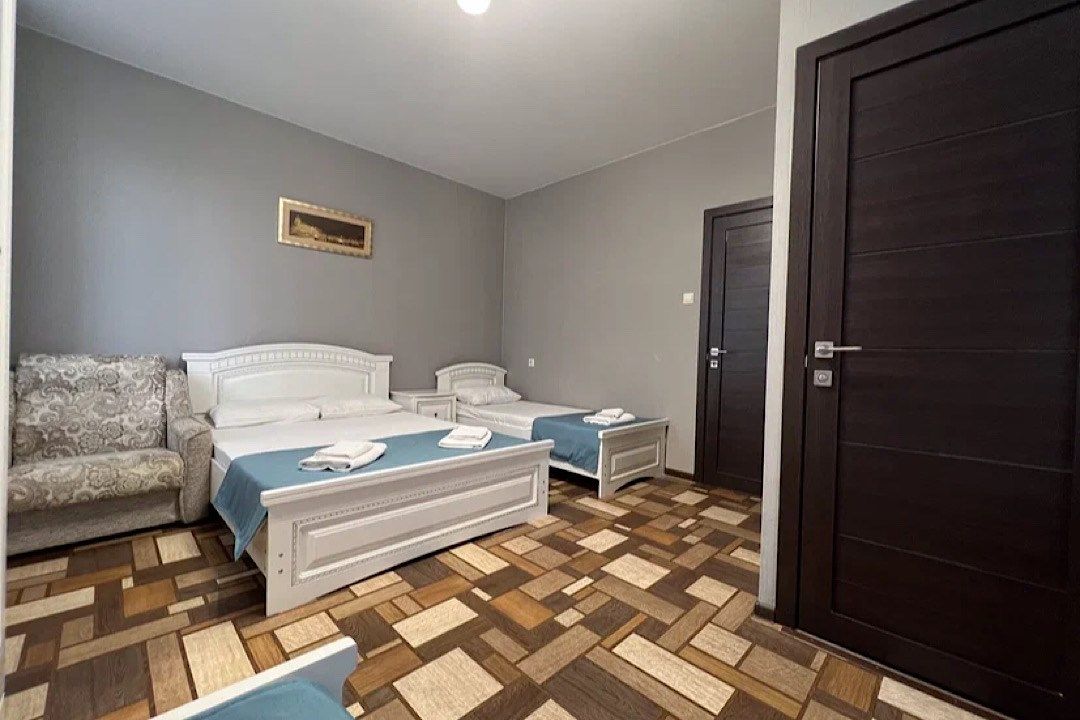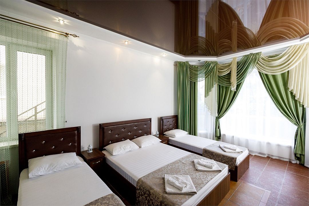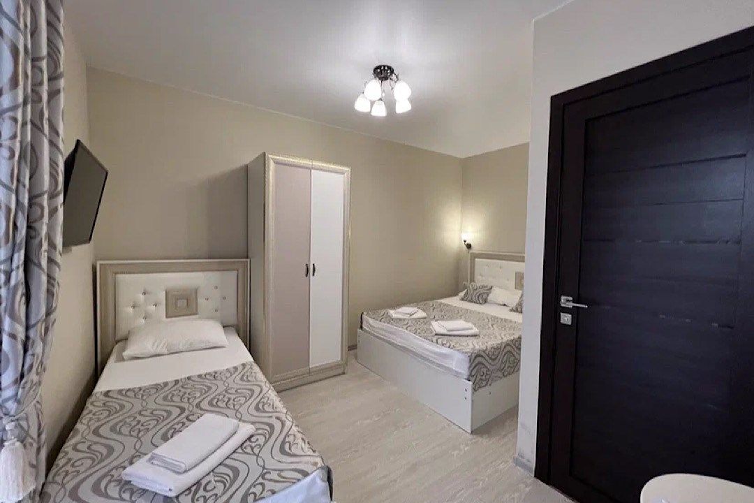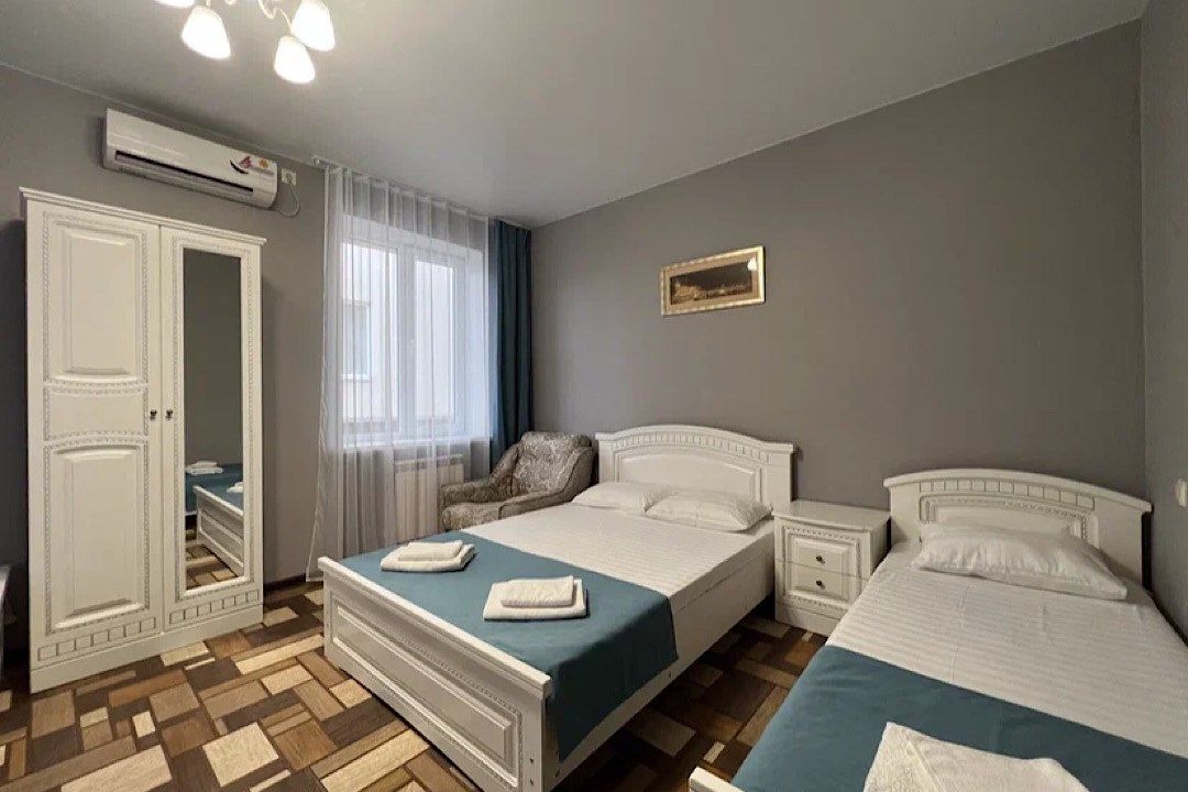 Wi-Fi, холодильник, кондиционер, фен, ванна, банные полотенца, двуспальная кровать, две односпальные кровати, шкаф для одежды, вешалки, журнальный столик, зеркало, пуфики, душ, вид во двор, тумба, туалетные средства, телевизор с плоским экраномВ гостиничном номере