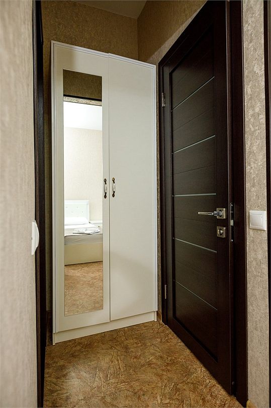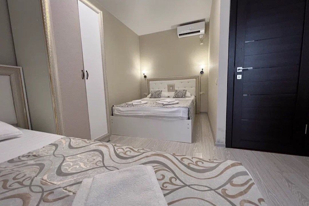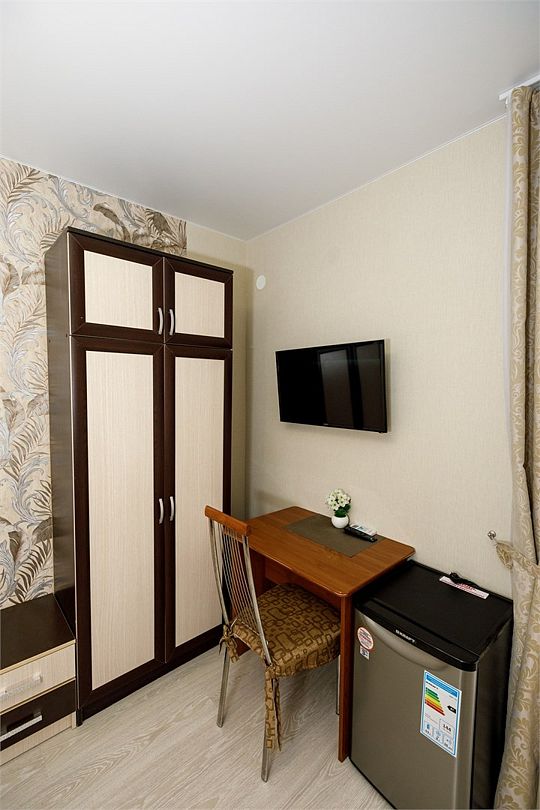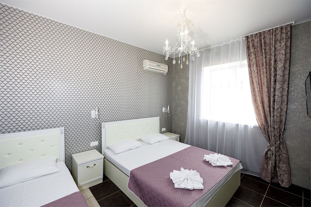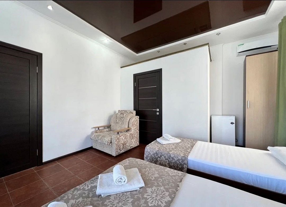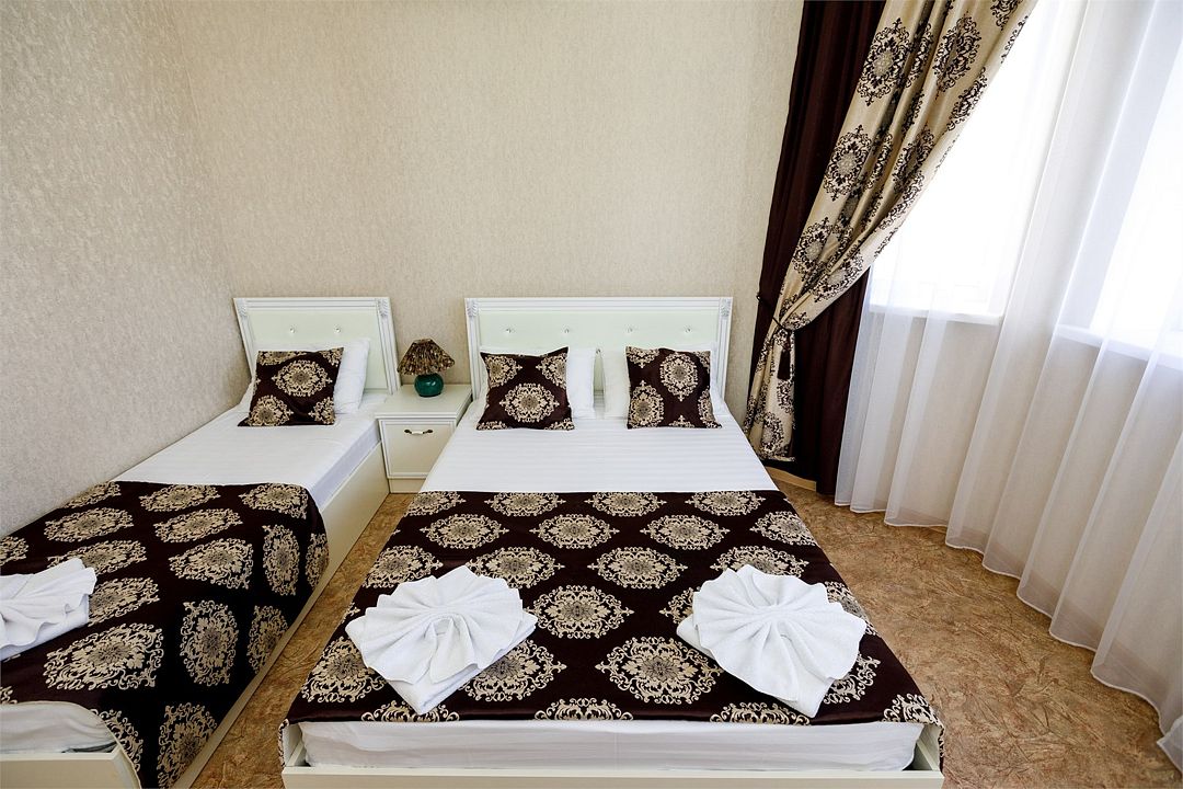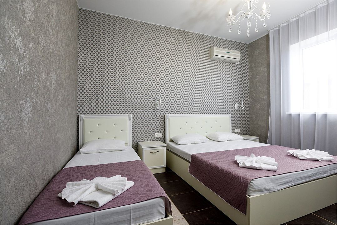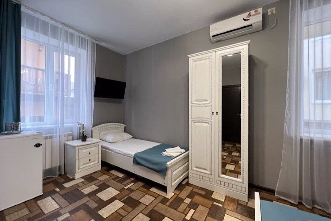 Wi-Fi, холодильник, кондиционер, фен, ванна, банные полотенца, двуспальная кровать, две односпальные кровати, шкаф для одежды, вешалки, журнальный столик, зеркало, пуфики, душ, вид во двор, тумба, туалетные средства, телевизор с плоским экраномВ гостиничном номере