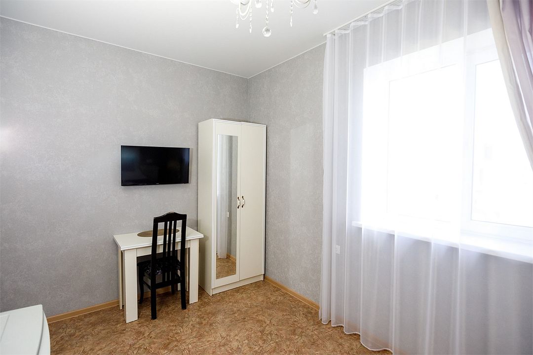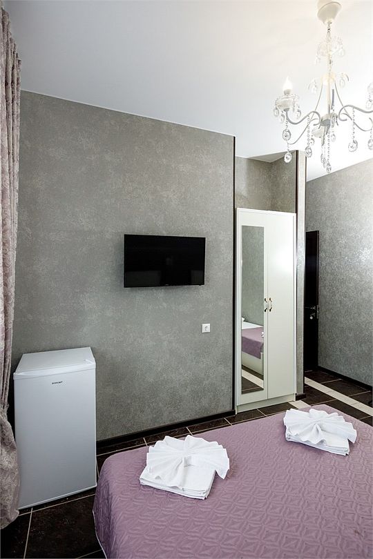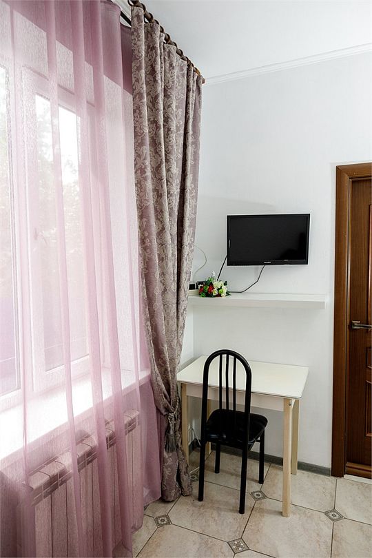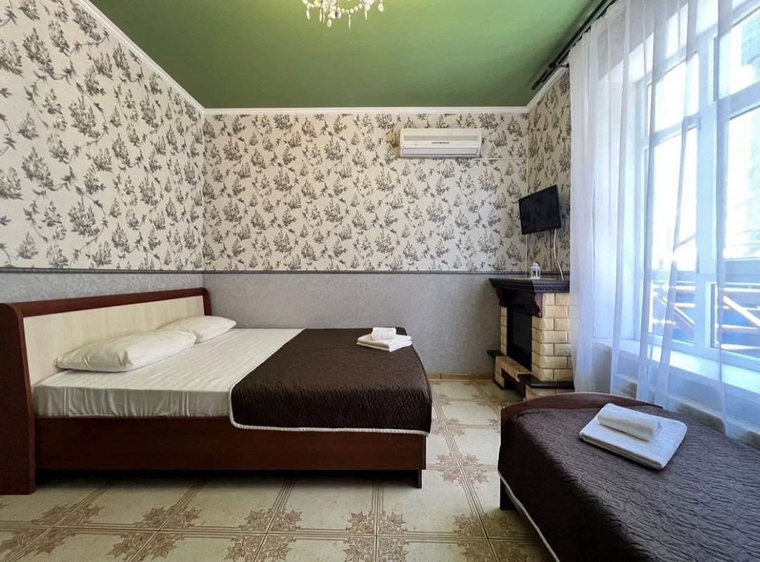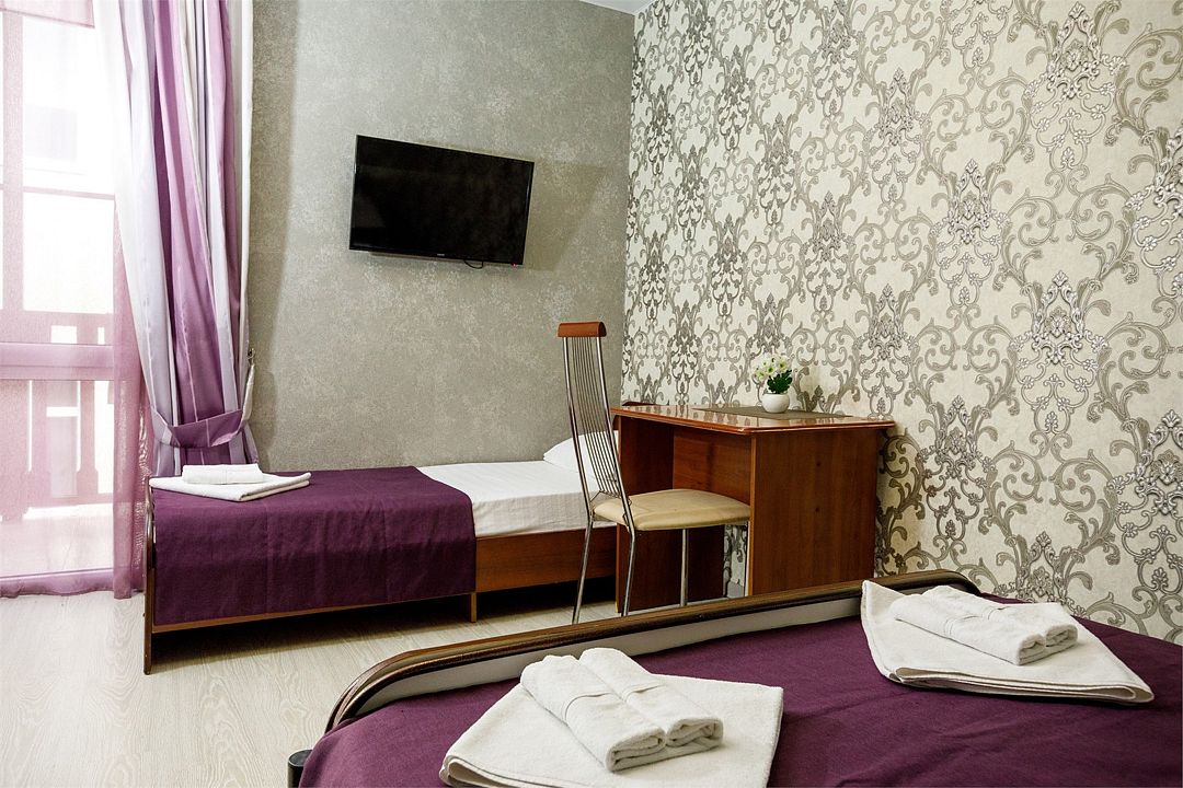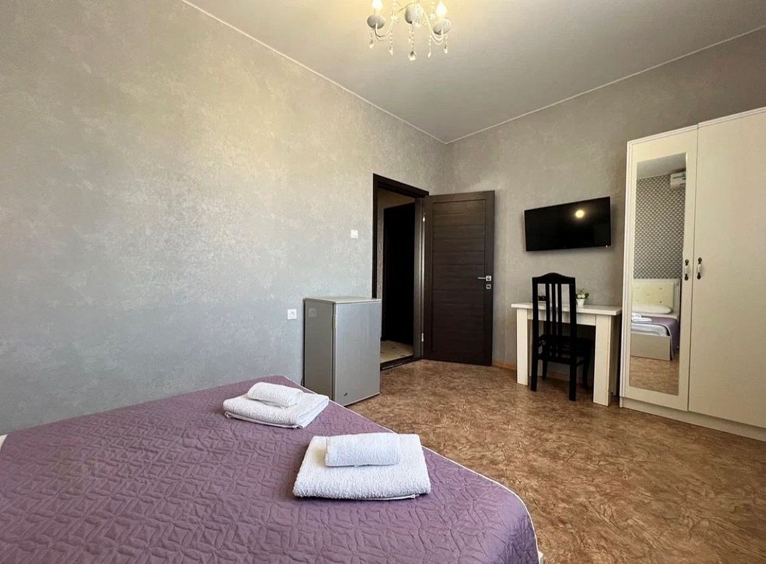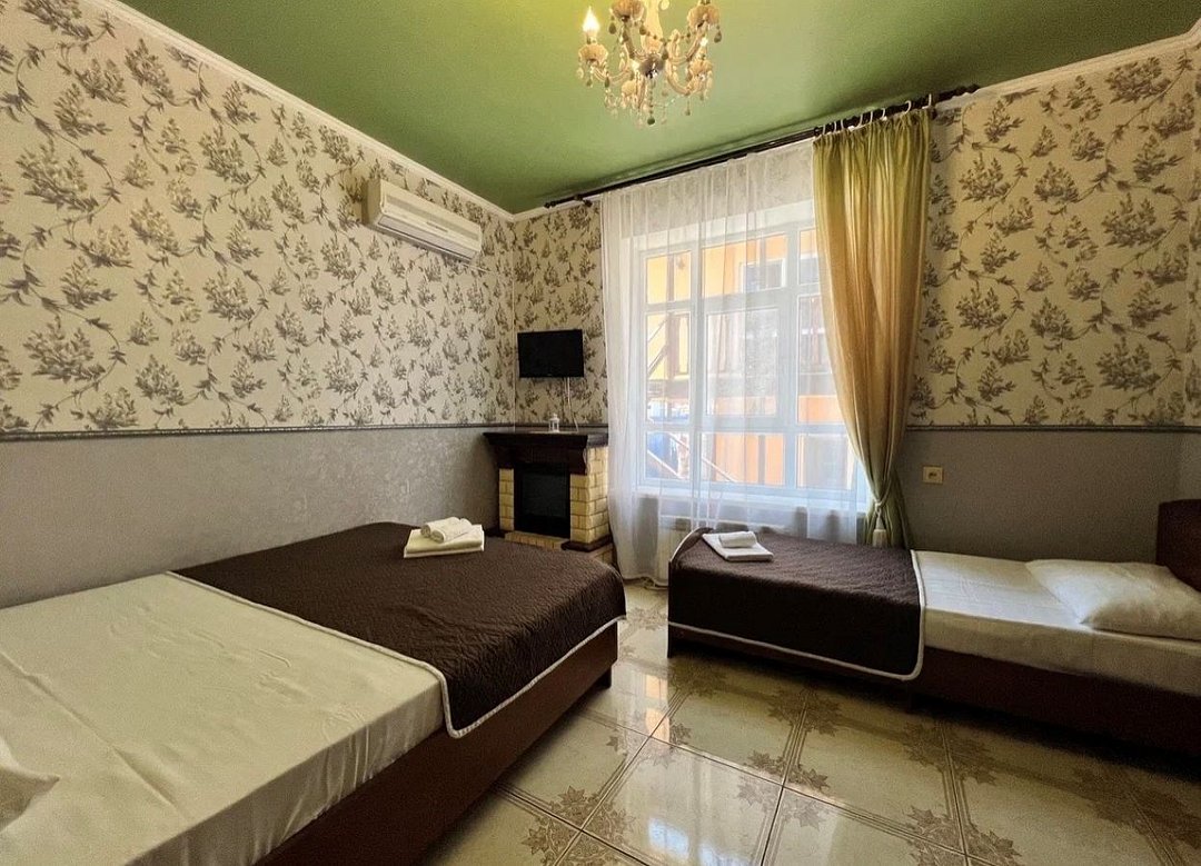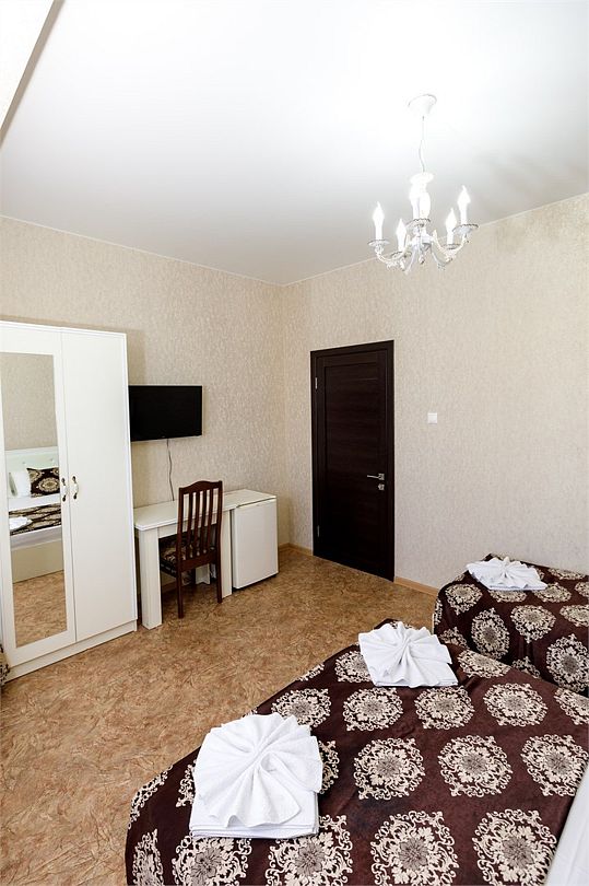 два телевизора, Wi-Fi, холодильник, кондиционер, фен, утюг, ванна, банные полотенца, две двуспальные кровати, односпальная кровать, тумбы, шкаф для одежды, вешалки, письменный стол, зеркало, обслуживание номеров, раковина, душ, вид во двор, стул, туалетные средства, туалетВ гостиничном номере