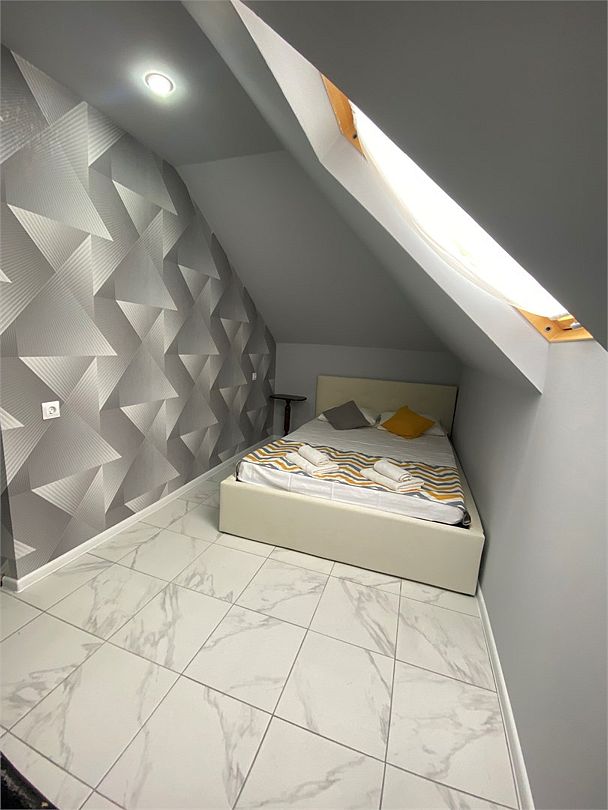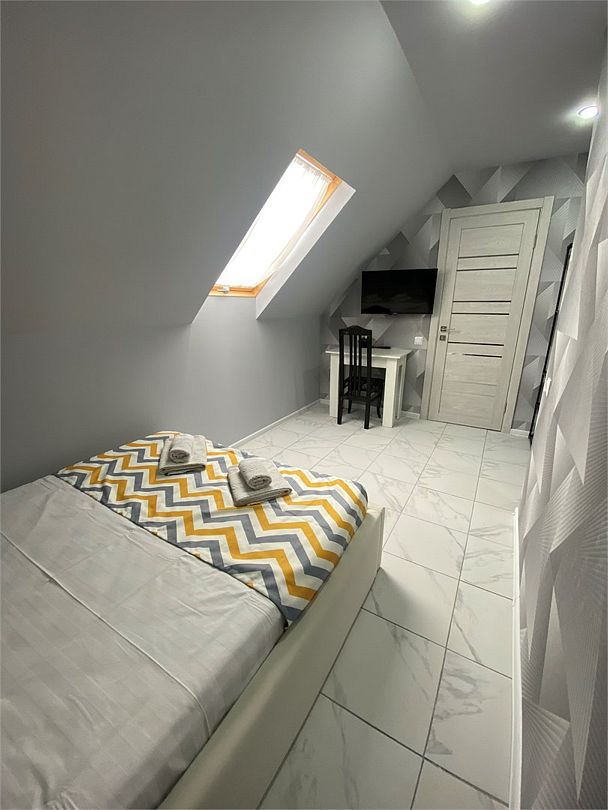 кабельное телевидение, Wi-Fi, кондиционер, фен, банные полотенца, шкаф для одежды, письменный стол, зеркало, душ, стул, тумба, туалет, телевизор с плоским экраном, мансардные окна, вешалки-плечики, открытый шкафВ гостиничном номере