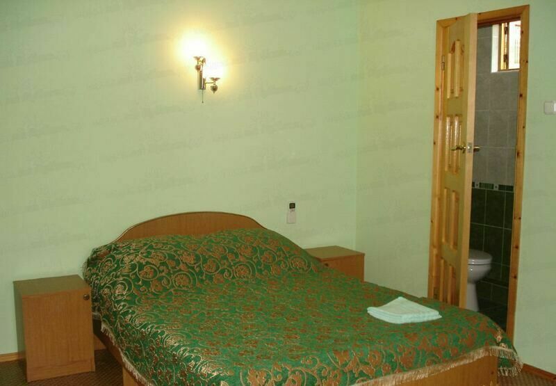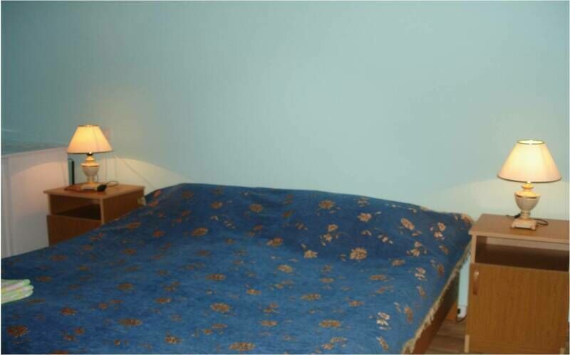 санузел с душем, телевизор (плазма), холодильник, двуспальная кровать, две тумбочки, платяной шкаф для одежды, стол и стул.