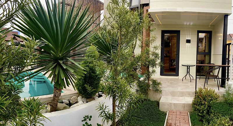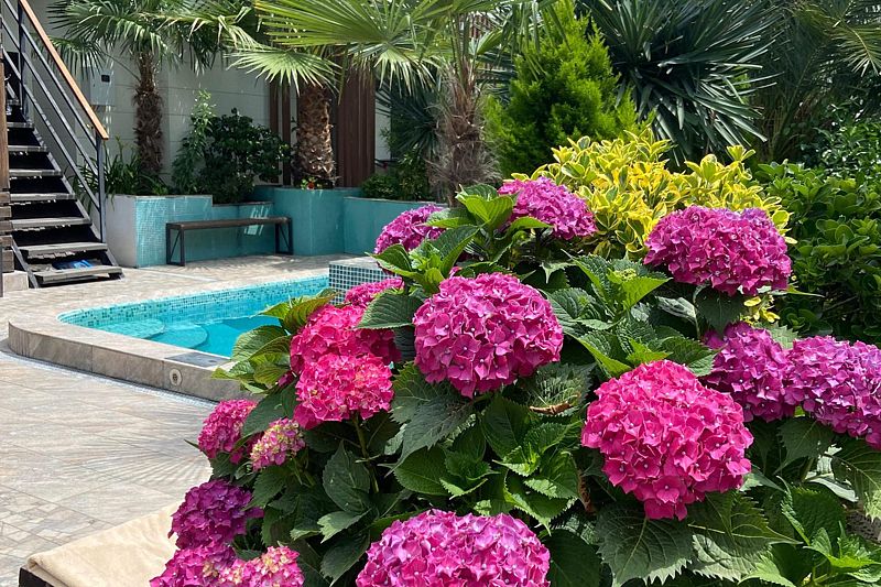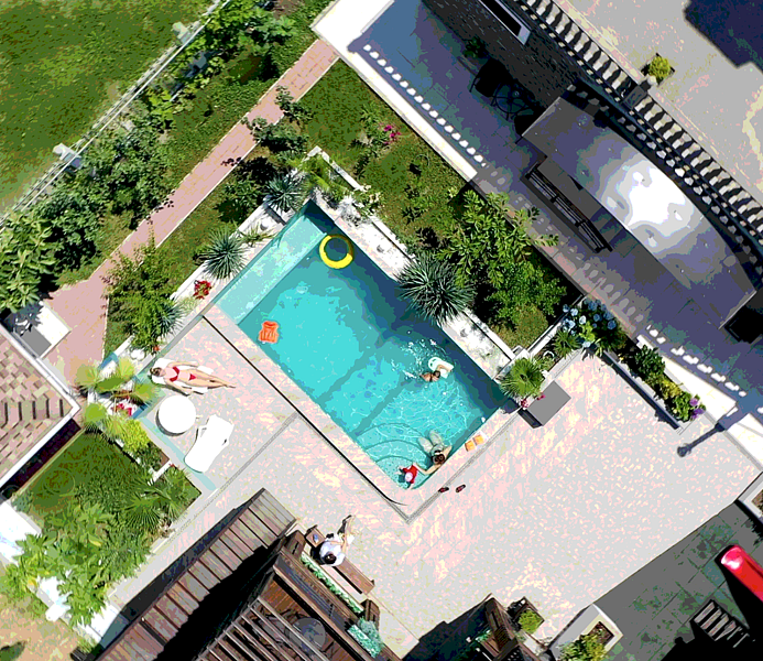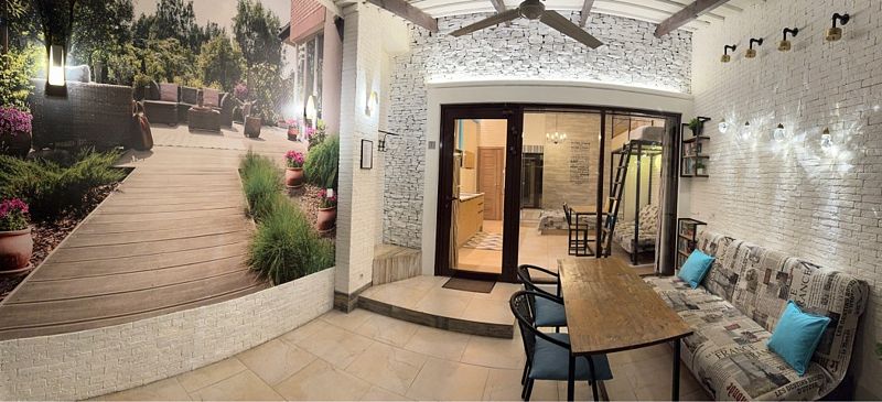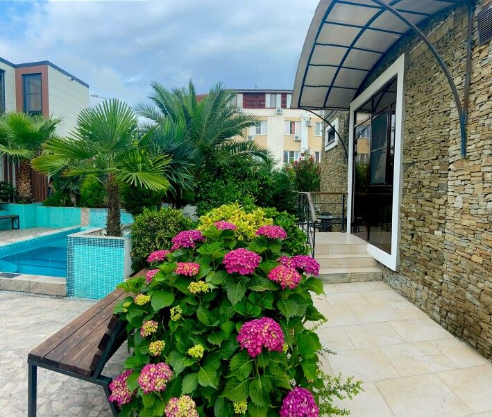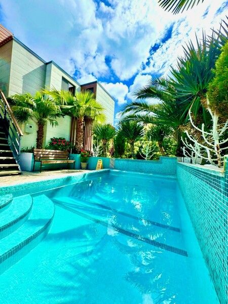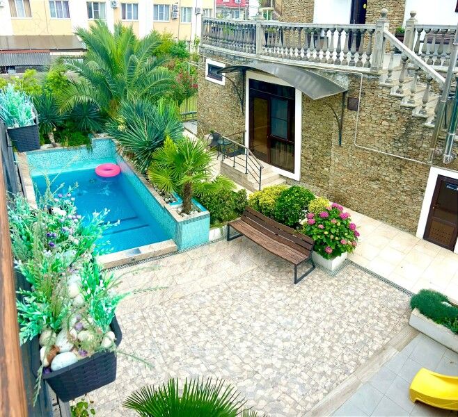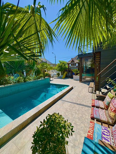 На свежем воздухе вас ожидает уютная зона отдыха с бассейном, а чуть выше на втором этаже находится терраса, укомплектованная диванами, столом и шезлонгами для комфортного времяпрепровождения. Зона отдыха доступна для гостей с 9:00 – 23:00, предлагая атмосферу расслабления и уединения.