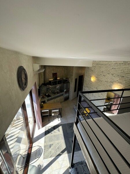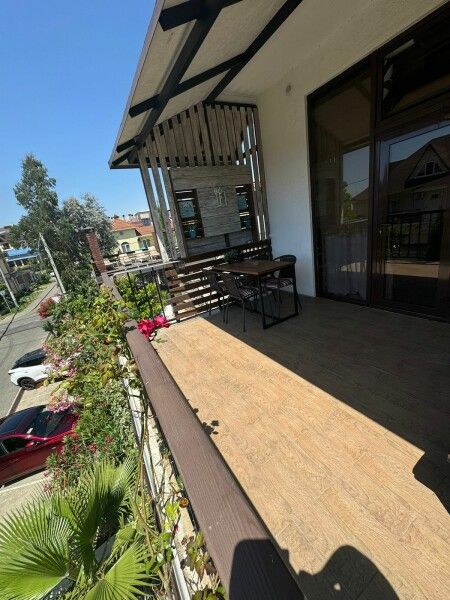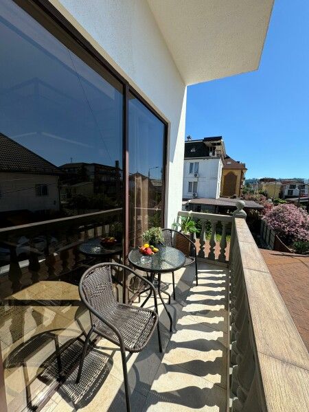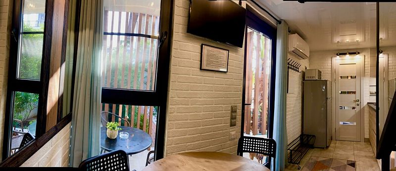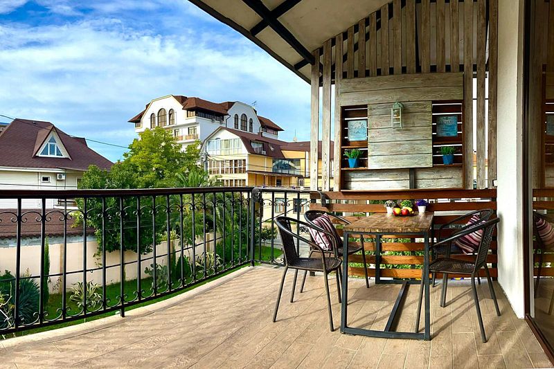 Комфортная студия расположена на 2 этаже и может вместить до 6 гостей: 5 взрослых и 1 ребенка. На просторной собственной террасе в уютных креслах можно насладиться утренним кофе.