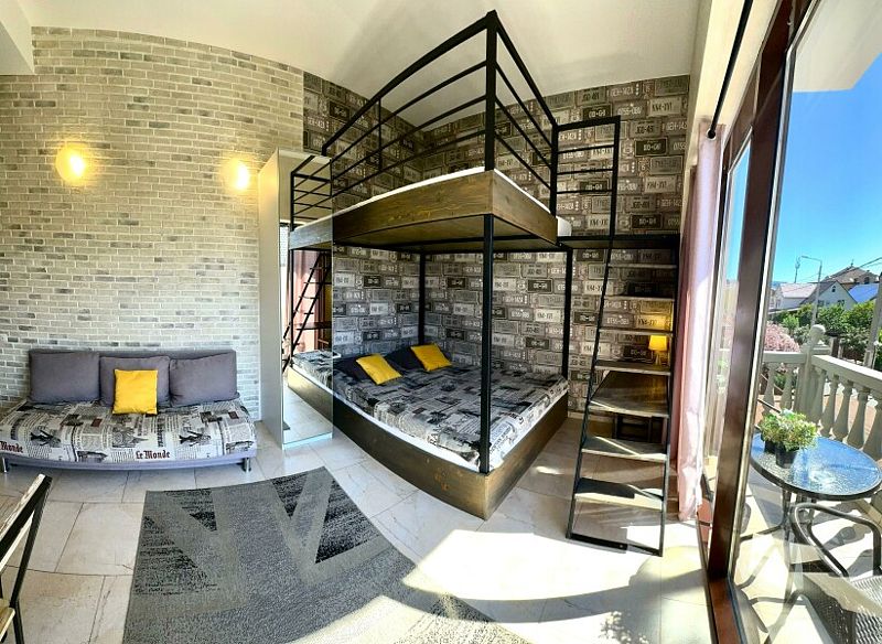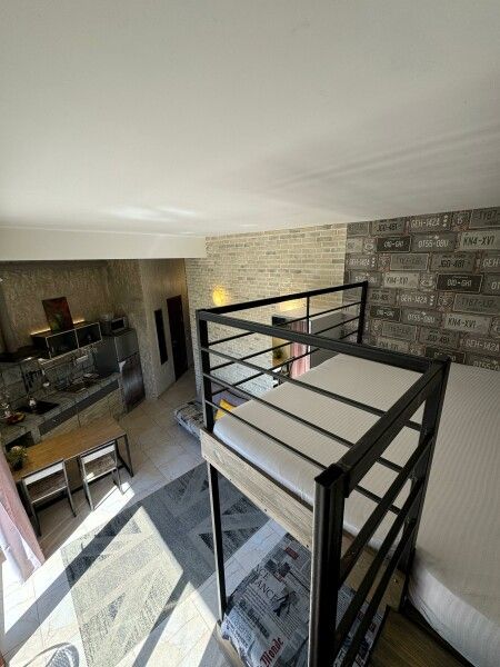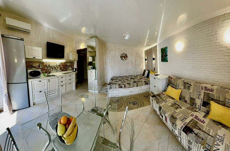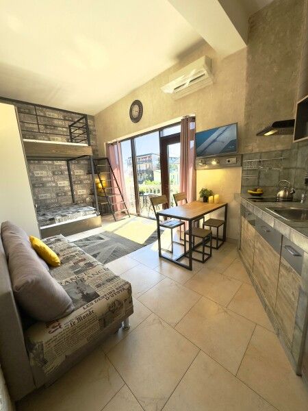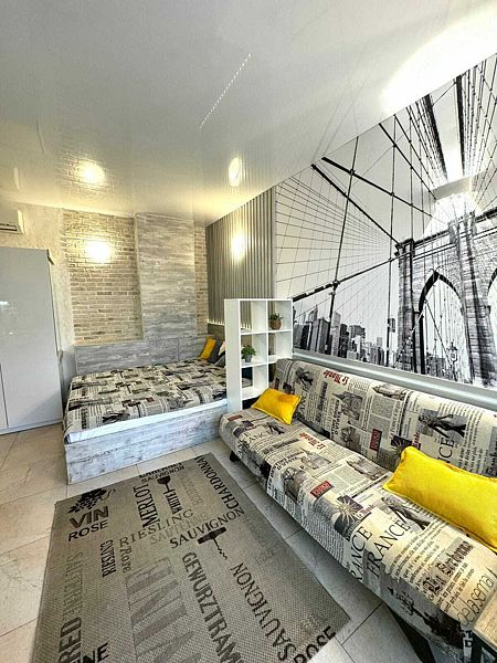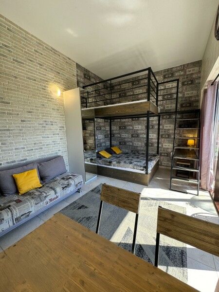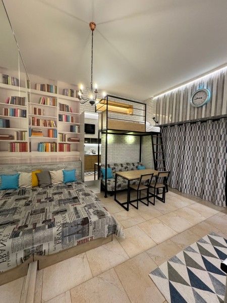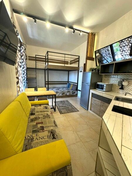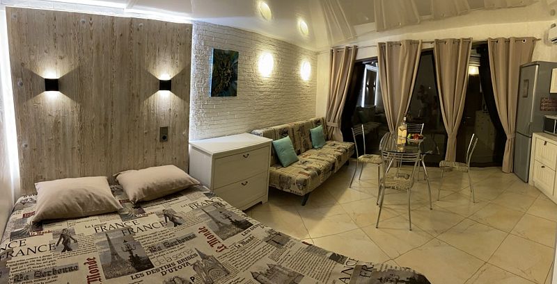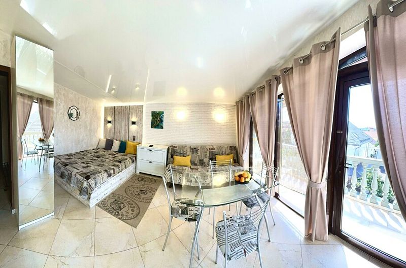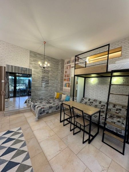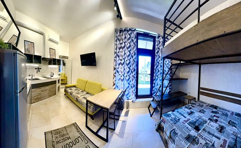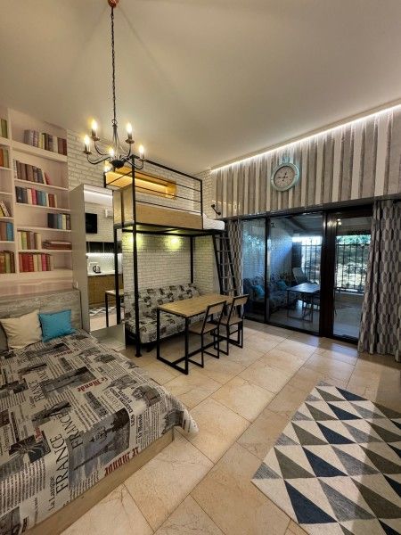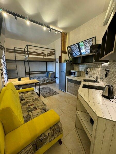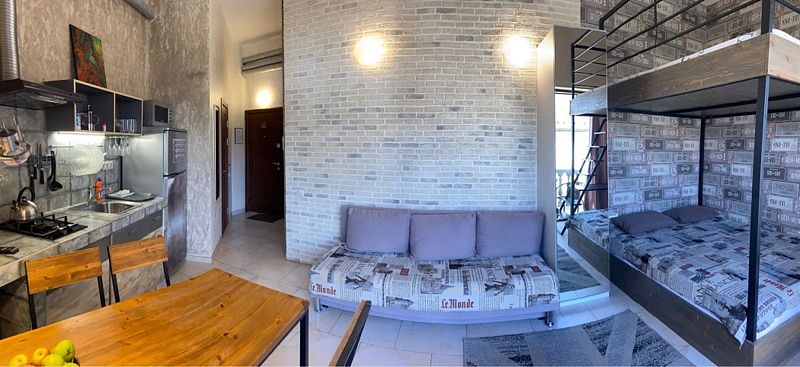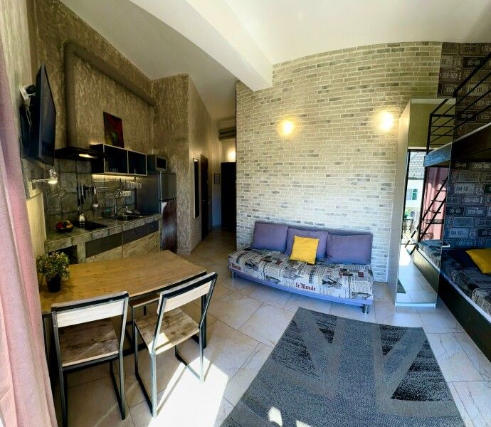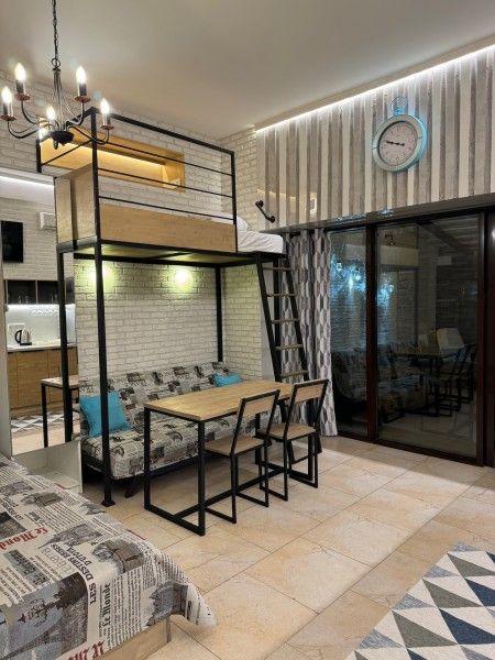 Комфортная студия расположена на 2 этаже и может вместить до 6 гостей: 5 взрослых и 1 ребенка. В студии двухуровневая кровать (на каждом уровне ортопедический матрас размером 160/200) и раскладывающийся диван.