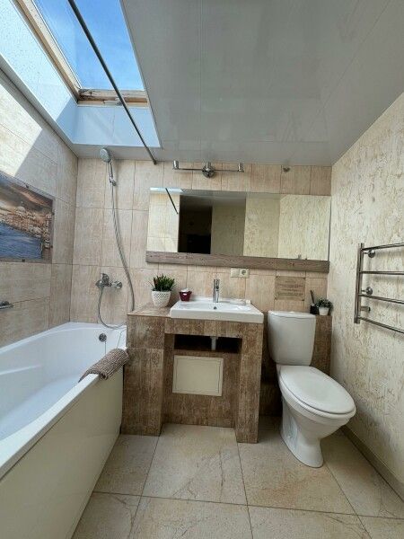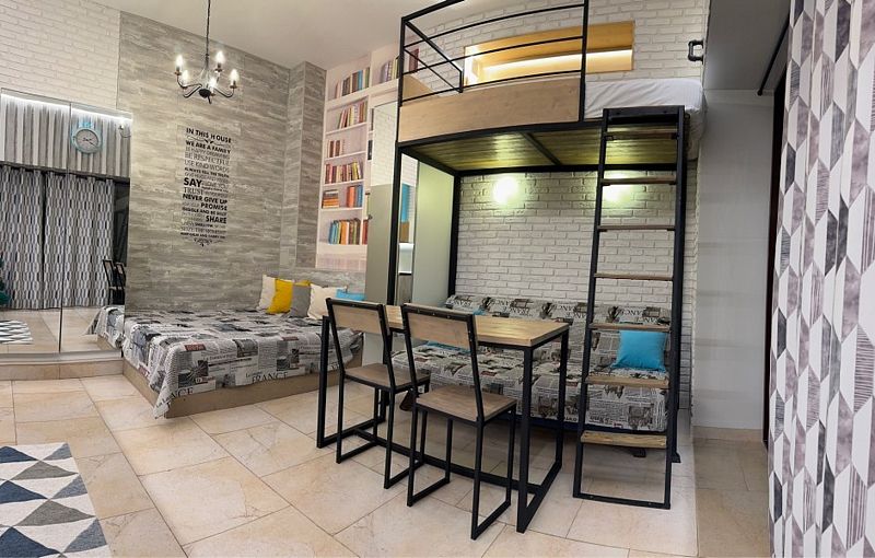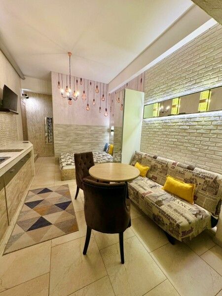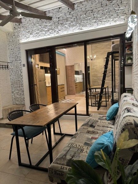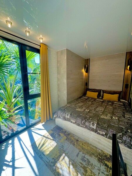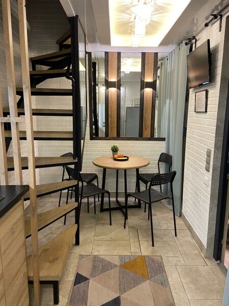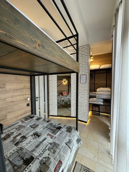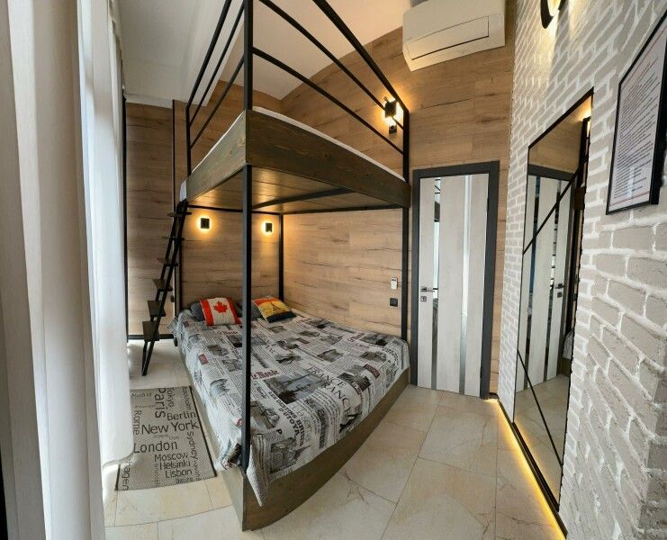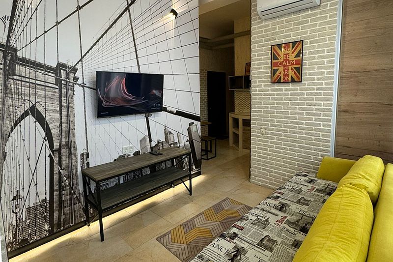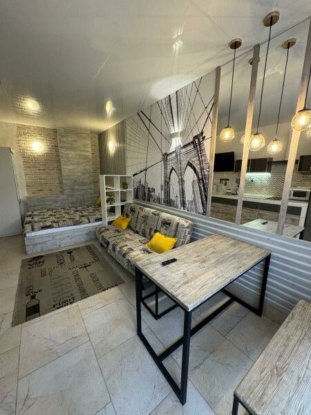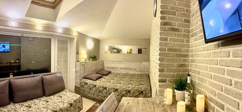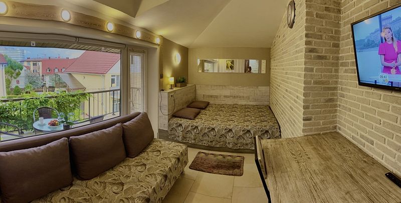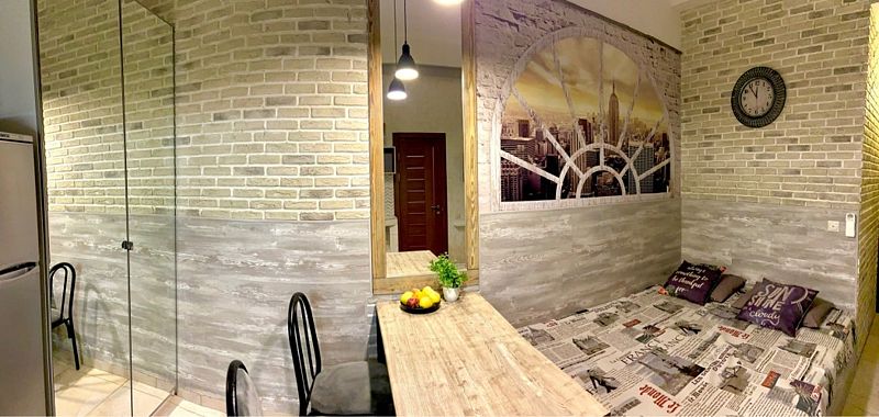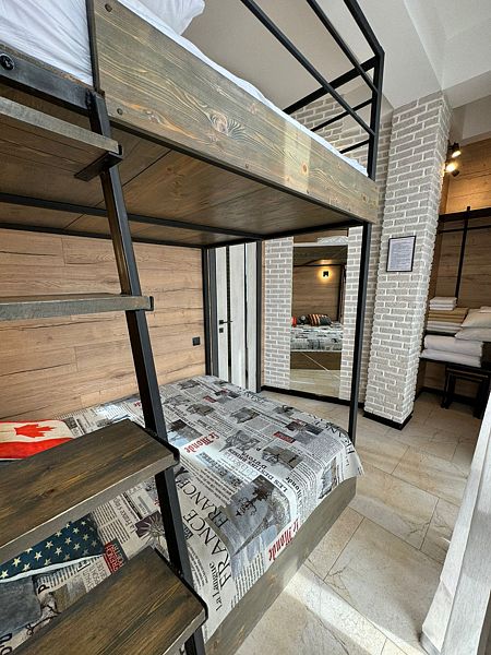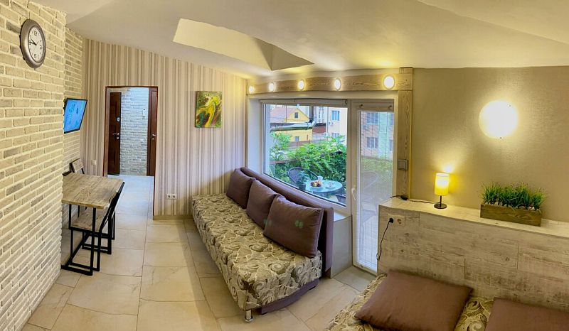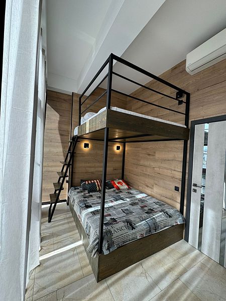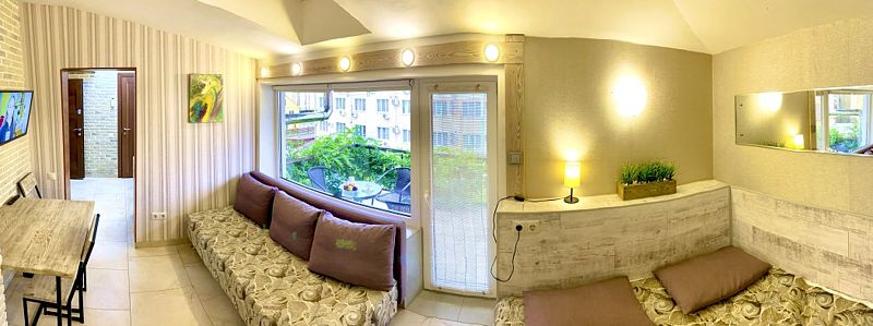 Комфортная студия расположена на 2 этаже и может вместить до 6 гостей: 5 взрослых и 1 ребенка. В студии двухуровневая кровать (на каждом уровне ортопедический матрас размером 160/200) и раскладывающийся диван.