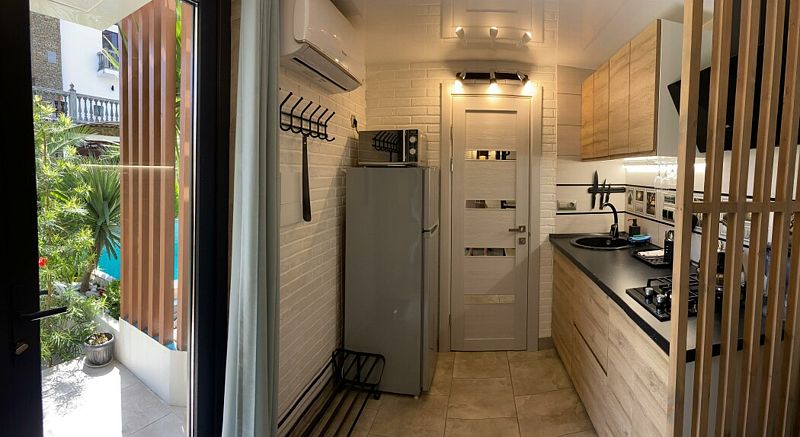 Уютная терраса позволит насладиться чашечкой утреннего кофе на открытом воздухе с видом на бассейн. На кухне вы найдете все необходимое для самостоятельного приготовления пищи: посуду, холодильник, СВЧ, плиту.