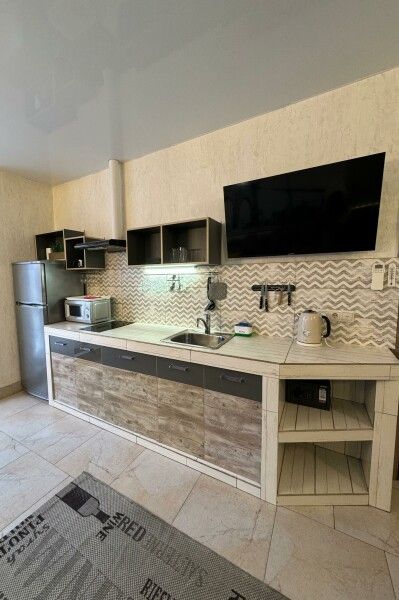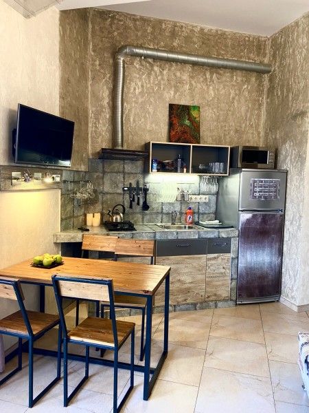 В студии двухуровневая кровать (на каждом уровне размером 160х200) и раскладывающийся диван. На кухне вы найдете все необходимое для самостоятельного приготовления пищи: посуду, холодильник, СВЧ, газовую плиту.
