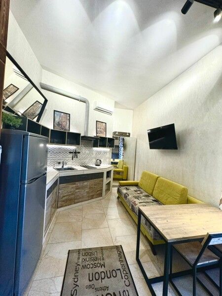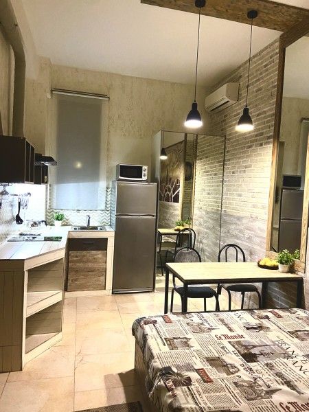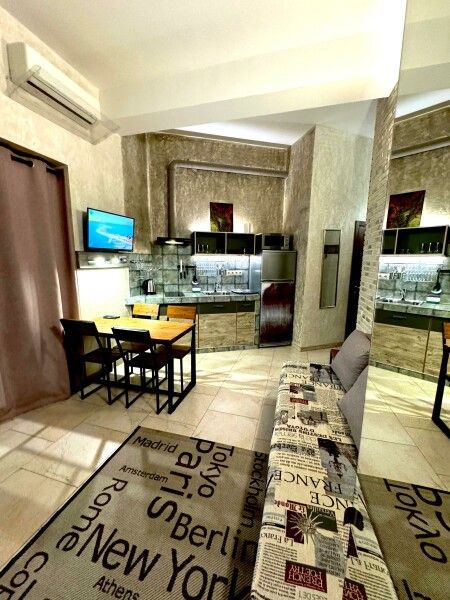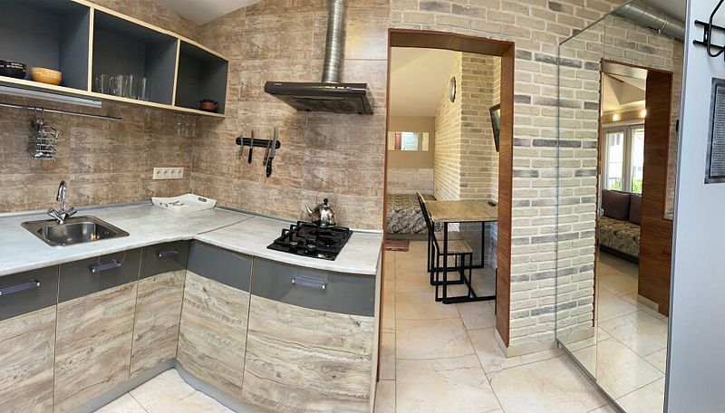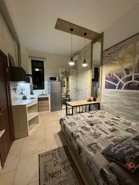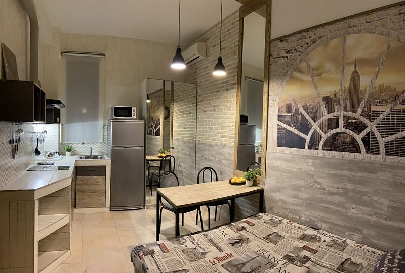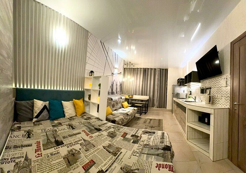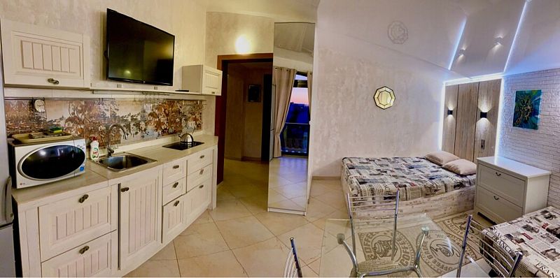 В студии двухспальная кровать с ортопедическим матрасом размером 160х200 и раскладной диван. На кухне вы найдете все необходимое для самостоятельного приготовления пищи: посуду, холодильник, микроволновую печь, газовую плиту.