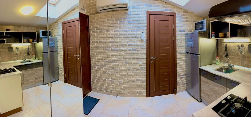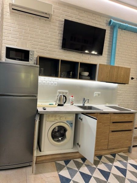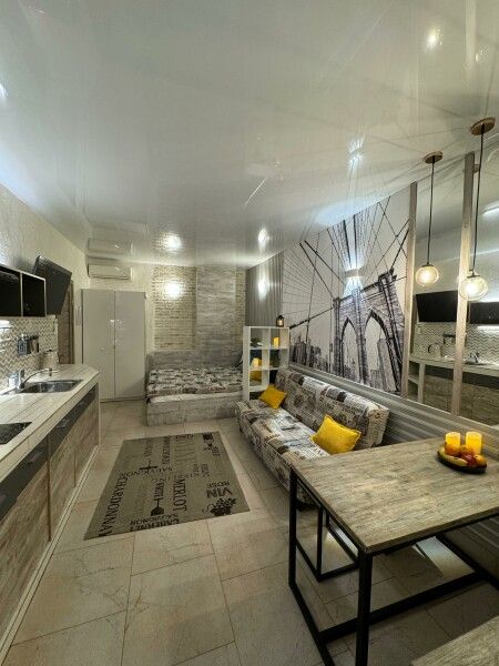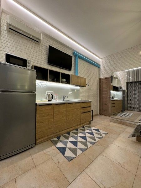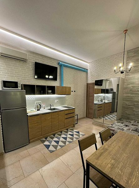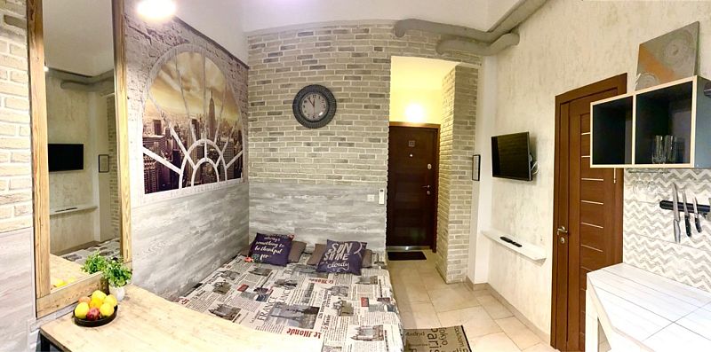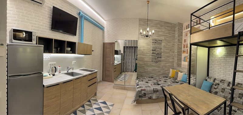 В студии двухспальная кровать с ортопедическим матрасом средней жесткости размером 160х200, раскладывающийся диван и односпальная кровать на втором уровне. На кухне вы найдете все необходимое для самостоятельного приготовления пищи: посуду, холодильник, СВЧ, плиту.