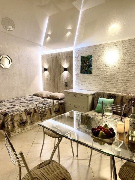 В студии двухспальная кровать с матрасом размером 160х200 и раскладывающийся диван. На кухне вы найдете все необходимое для самостоятельного приготовления пищи: посуду, холодильник, СВЧ, плиту.