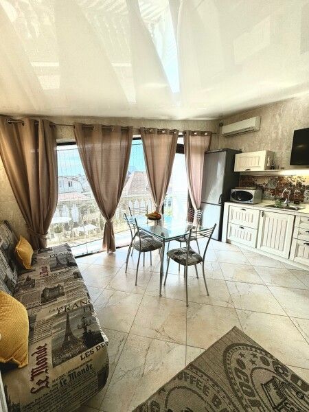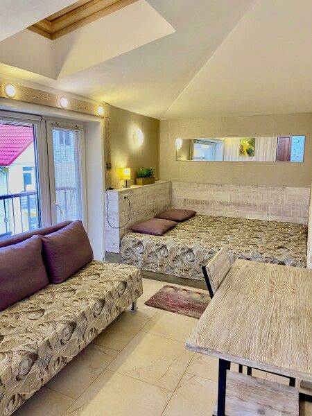 Комфортная студия с отдельной спальней и балконом расположена на 2 этаже и может вместить до 6 гостей: 5 взрослых и 1 ребенка. В спальне двухуровневая кровать (на каждом уровне ортопедический матрас размером 160х200) и в зале раскладной диван.