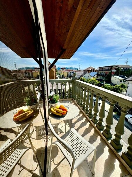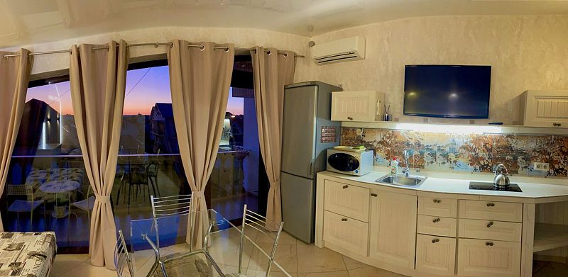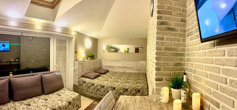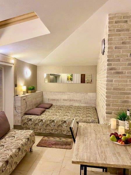Комфортная студия расположена на 3 этаже и может вместить до 3 гостей: 2 взрослых и 1 ребенка. На просторной террасе Вы найдете удобную мебель, располагающую к романтическому времяпрепровождению.