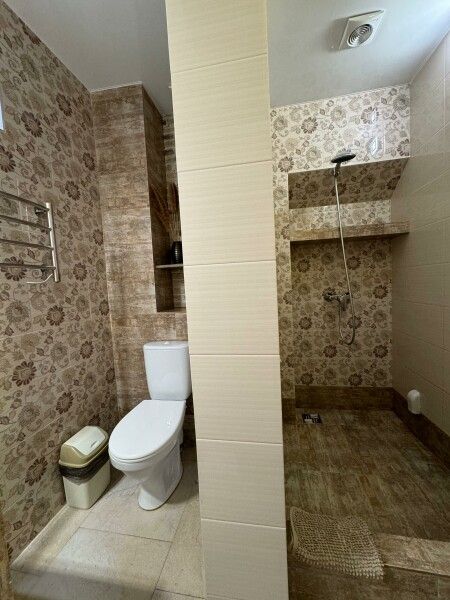На кухне вы найдете все необходимое для самостоятельного приготовления пищи: посуду, холодильник, СВЧ, плиту. В отдельном санузле установлена душевая кабина, умывальник, полотенцесушитель, удобные полочки, зеркало, фен.