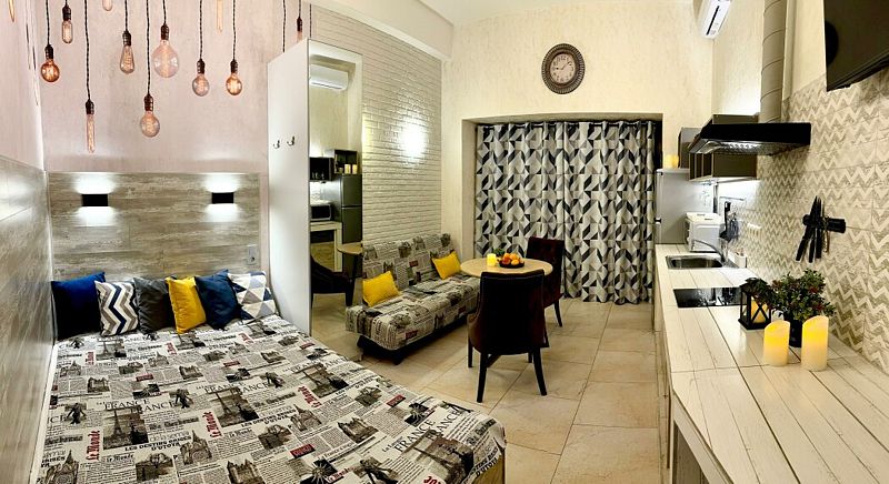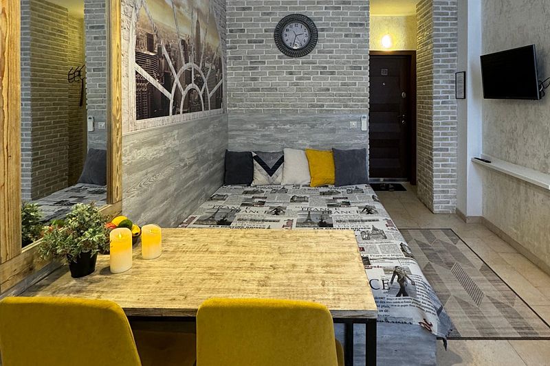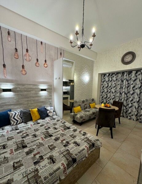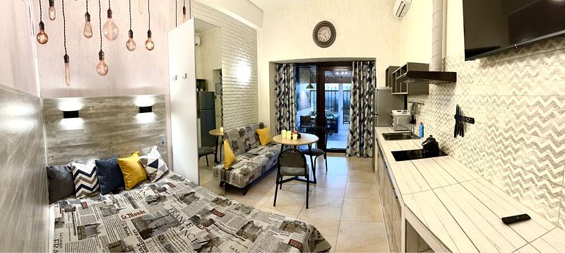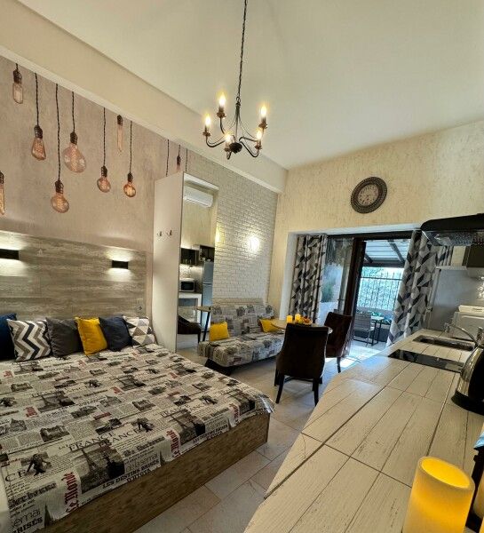 Комфортная студия расположена на 1 этаже и может вместить до 4 гостей: 3 взрослых и 1 ребенка. В студии двухспальная кровать с матрасом размером 160х200 и раскладной диван-кровать.
