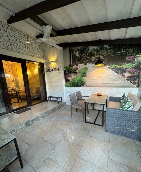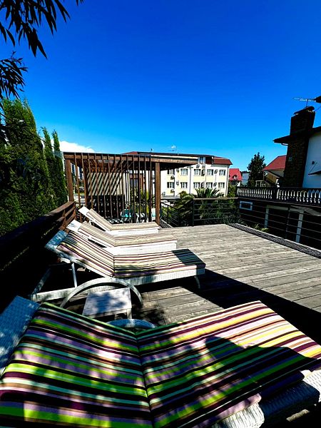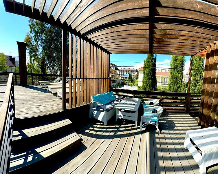 На свежем воздухе вас ожидает уютная терраса с комфортными диванами и шезлонгами, идеально подходящая для отдыха под открытым небом. Круглый год подогреваемый бассейн станет прекрасным дополнением к вашему отдыху, а беседка с мангалом — отличной площадкой для вечерних встреч. Для маленьких гостей предусмотрена детская площадка, где они смогут весело провести время.