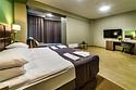 Номер состоит из одной комнаты, санузла, прихожей. В номере имеются 2 кровати, кресло-кровать, стул, 2 стола журнальный, туалетный с зеркалом набор посуды (графин и чашки), 2 прикроватные тумбочки, 2 прикроватные бра, телевизор, холодильник, телефон, сейф, шкаф.