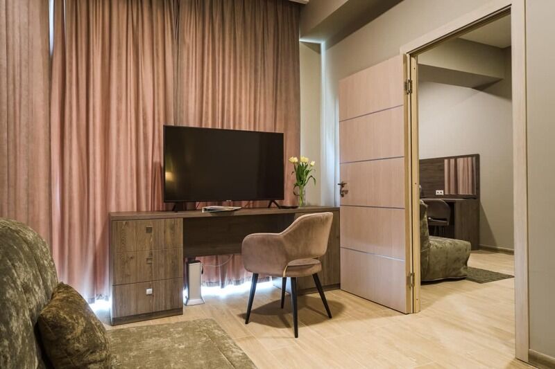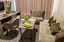 В номере имеются 2 кровати, стул, 3 кресло-кровати, стол туалетный с зеркалом, стол журнальный, стол под телевизор; 2 прикроватные тумбочки, 1 телевизора, холодильник, телефон, сейф, два шкафа.