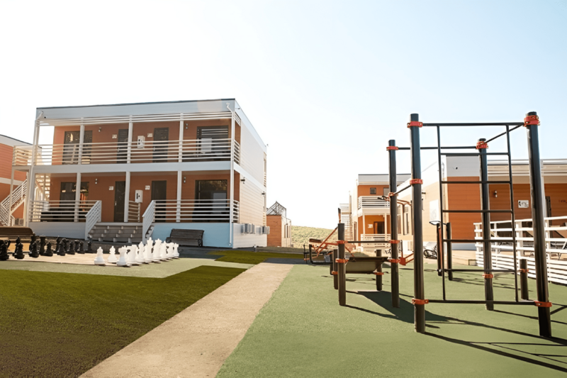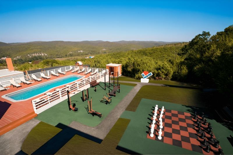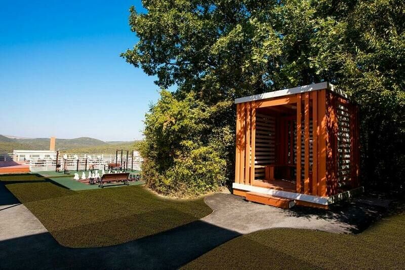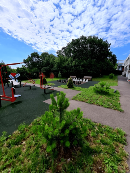 На территории расположена фитнес-зона с тренажерами, где гости могут совмещать отдых с активными занятиями на свежем воздухе.