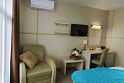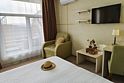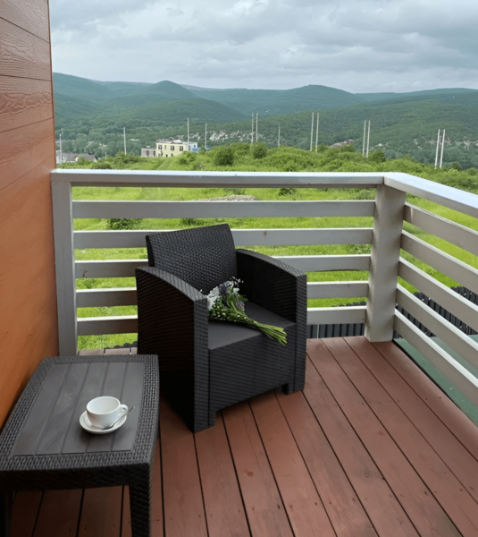 Трехместный номер в стиле «Полулюкс» предлагает вам непревзойденный вид с балкона на величественные горы, окруженный зеленым оазисом сада. Откройте окно, чтобы погрузиться в бескрайние просторы горных вершин и насладиться с террасы великолепием природы, раскинувшейся перед вашим взором.
