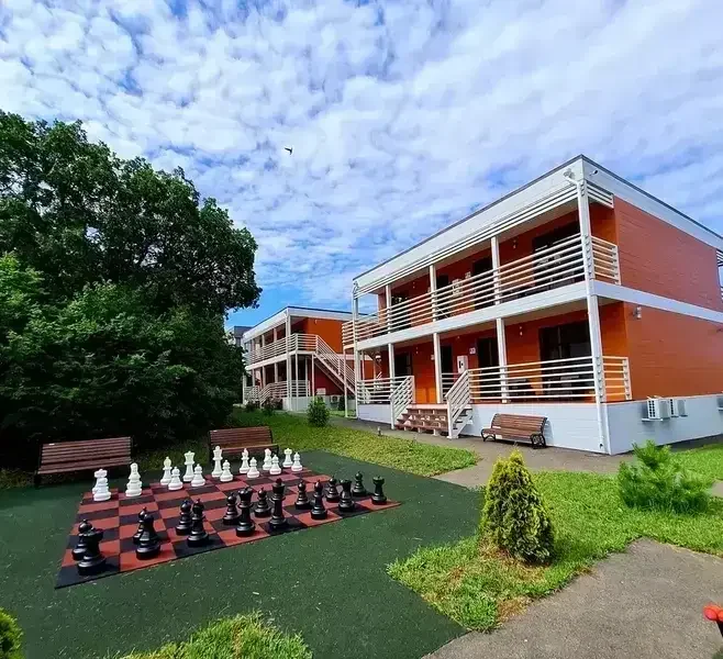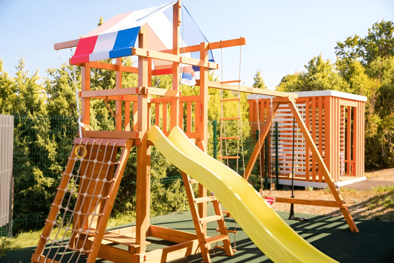 На территории расположена большая детская площадка, где ваши дети могут играть в активные игры на свежем воздухе.