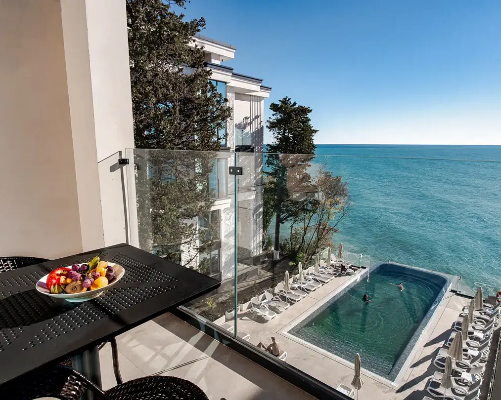 Двухкомнатные стильные апартаменты категории «Делюкс», площадью 50 м², идеально подходят для семейного размещения или отдыха повышенной комфортности. Панорамные окна и балкон, с которого открывается вид на море, создают неповторимую атмосферу и дают в полной мере насладиться отдыхом на побережье.