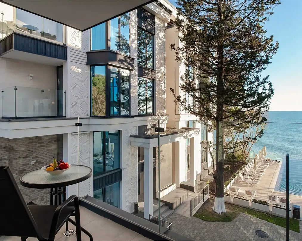 Стильные однокомнатные апартаменты площадью 21 м² отличаются современным и эргономичным дизайном. Панорамные окна и балкон с боковым видом на море создают неповторимую атмосферу, позволяя в полной мере насладиться отдыхом на побережье. Номера располагаются в главном корпусе на втором этаже и выше, а также в новом корпусе номер четыре.
