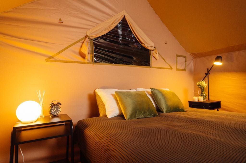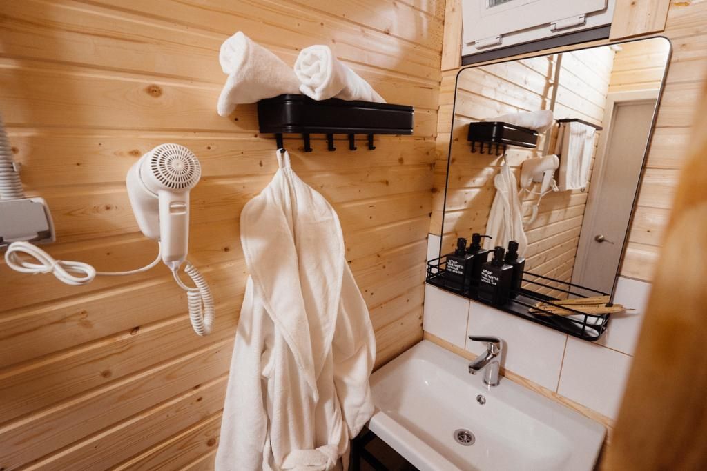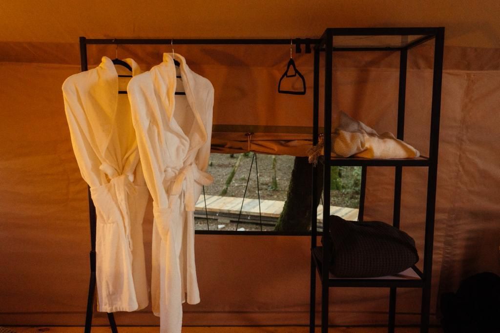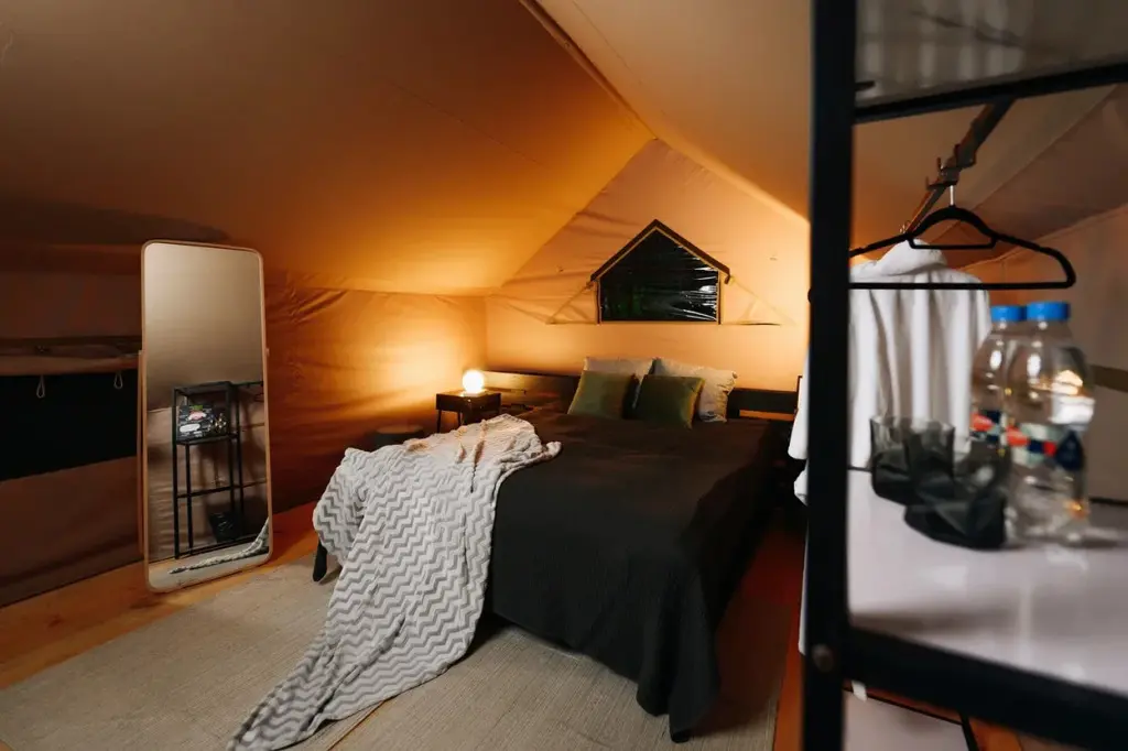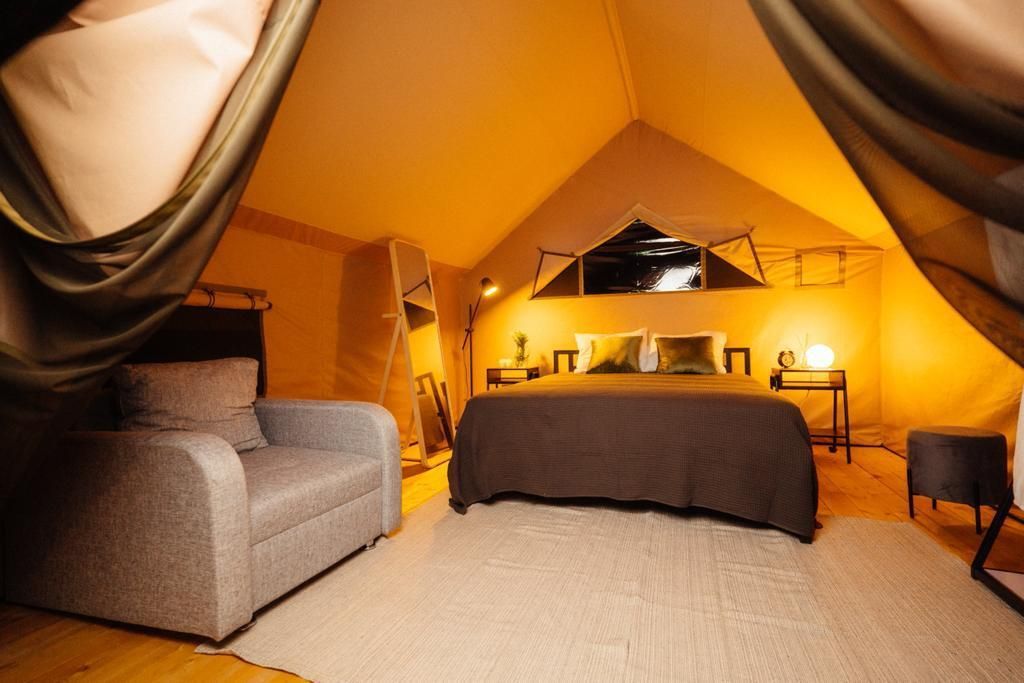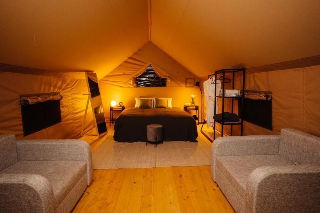 Проживание в люксовом шатре: 1 двуспальная кровать, 1 кресло-кровать, индивидуальная ванная комната с туалетом и душем (находится в отдельном строении, в шаговой доступности от номеров) Банные принадлежности и халаты.