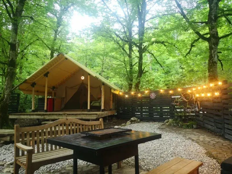 Шатры расположены далеко от друга, так что вы ощутите полное единение с природой, испытаете прохладу в жару и спокойствие в неторопливый день - свежий горный воздух, тихий шелест самшитов и журчание горной реки.