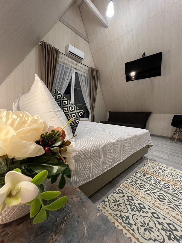 Номер оборудован всем необходимым для комфортного проживания: просторная кровать с ортопедическим матрасом, современная ванная комната, кондиционер и высокоскоростной Wi-Fi. Отдыхайте в гармонии с природой, наслаждайтесь уютом и роскошью – ваш идеальный отдых начинается здесь.