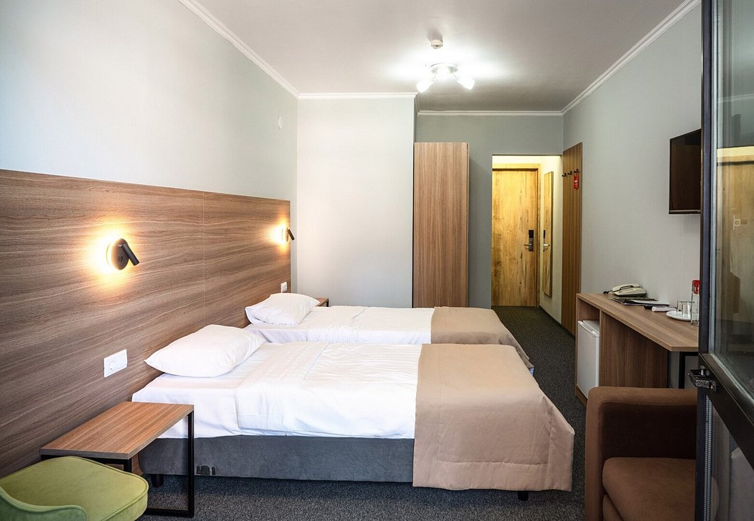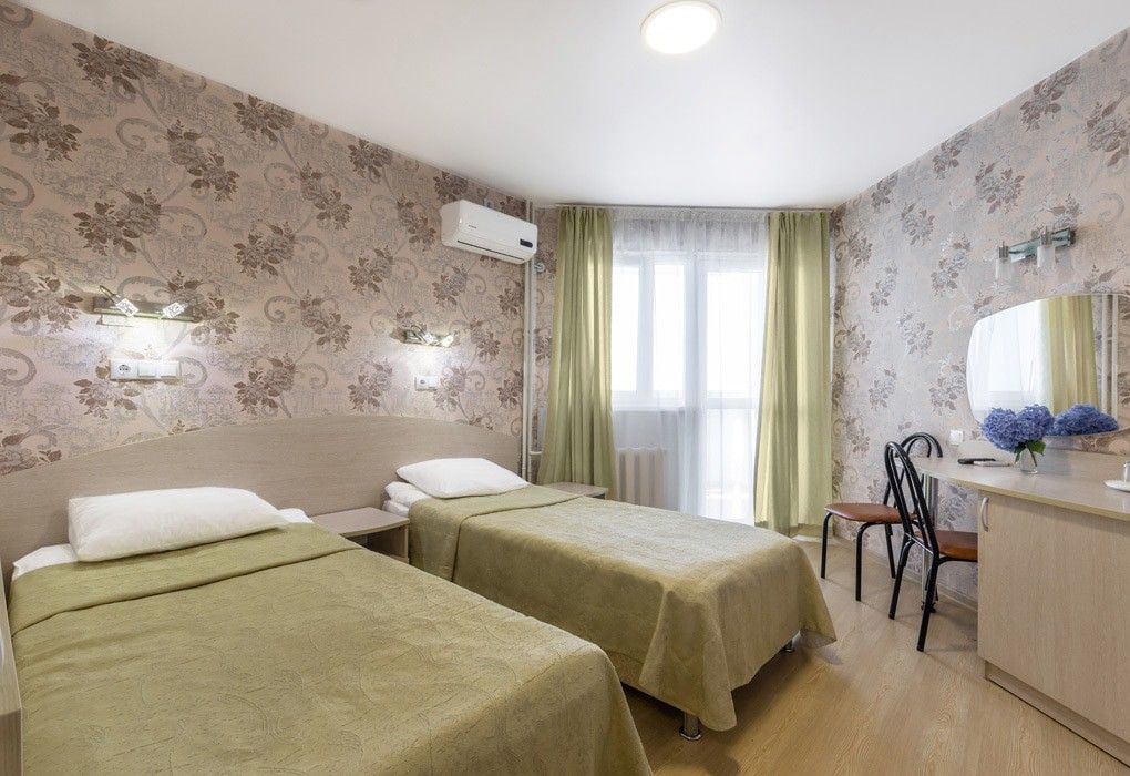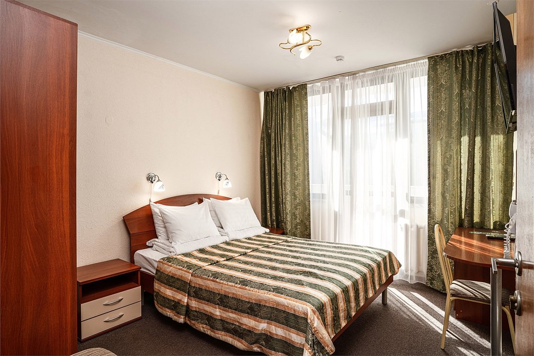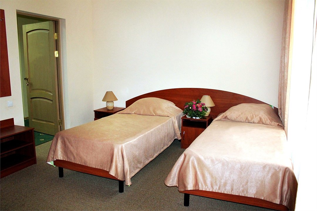Двухместный однокомнатный номер (относится к 1-ой категории). Номера расположены в корпусах № 2 и 6. Номер оснащен халатами и тапочками. В номере есть все, необходимое для отдыха и оздоровления. Если Вам нужна дополнительная уборка, дополнительная смена постельного белья, туалетные принадлежности - обратитесь к сотрудникам службы приема и размещения - услуга платная. Для самых маленьких гостей предоставляются бесплатно: детские кроватки (1250*650), услуга под запрос.Услуги и удобства