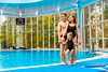 Бассейн оснащен водными аттракционами: водопадом, гидромассажем и системой плавания против течения.