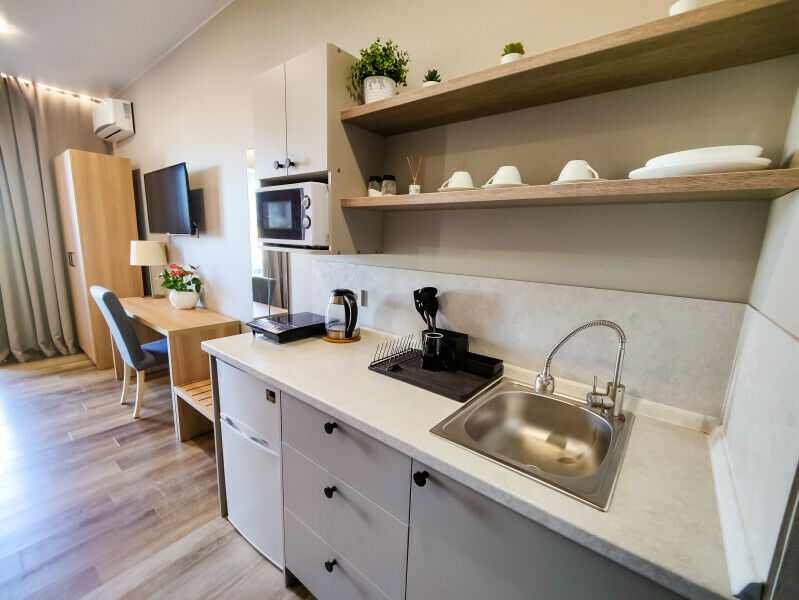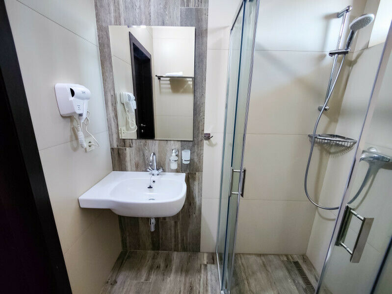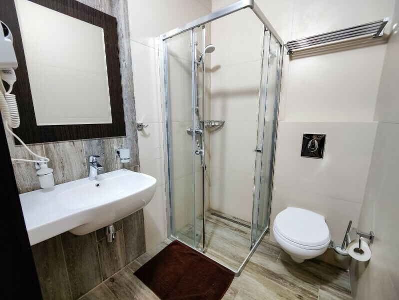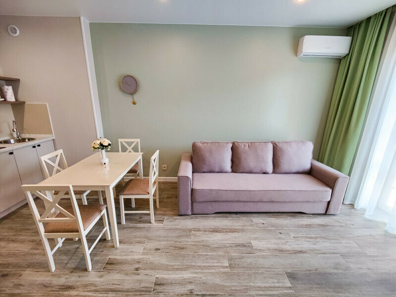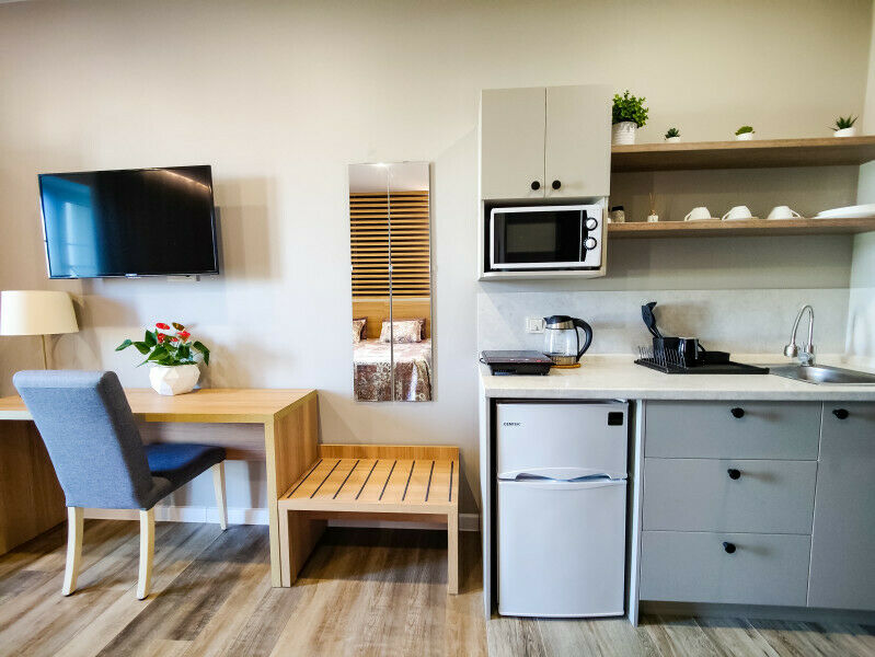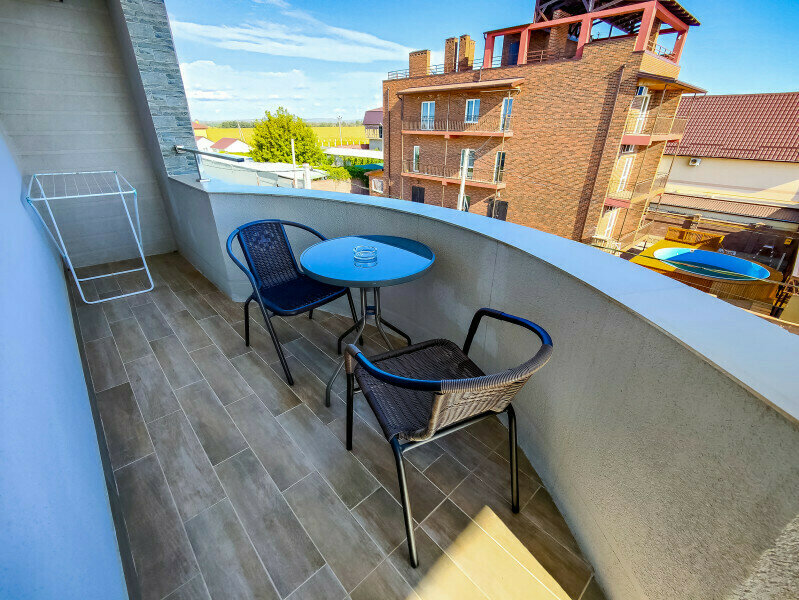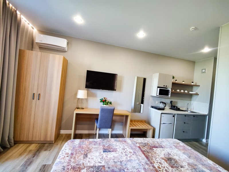 В комнате есть возможность установить два дополнительных места, детская кроватка (по запросу). В ванной комнате: современная сантехника, душевая кабина, туалетные принадлежности, махровые полотенца, фен. Уличная мебель на балконе. Сушилка для белья. В комплексе есть прачечная и место для глажки белья.