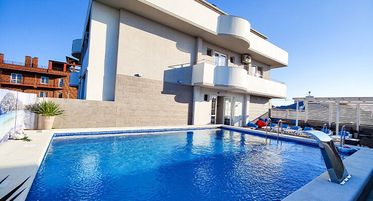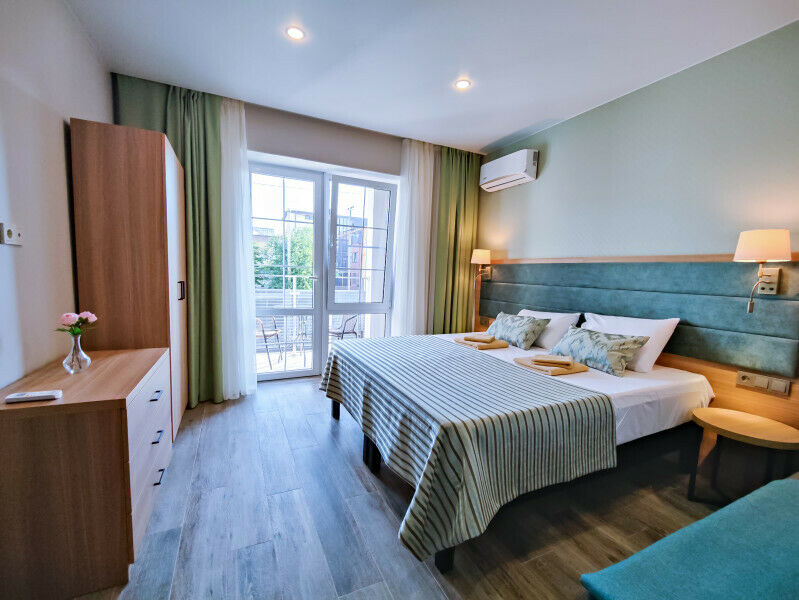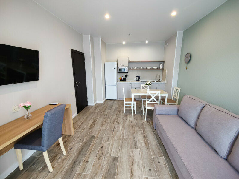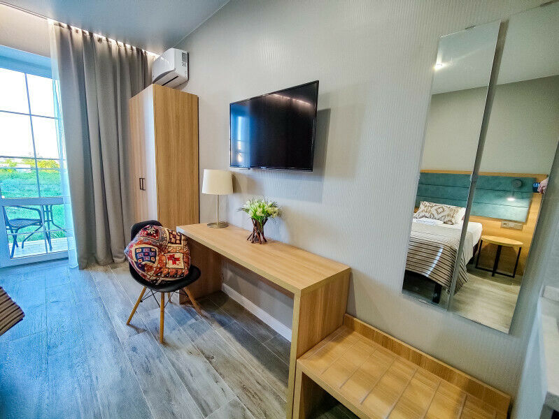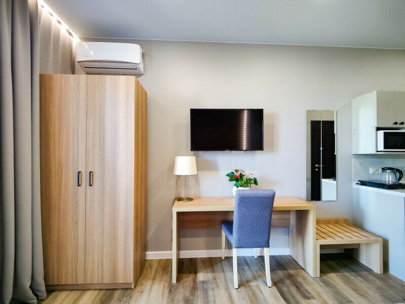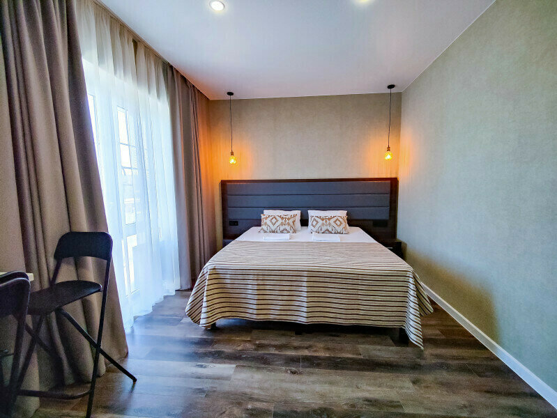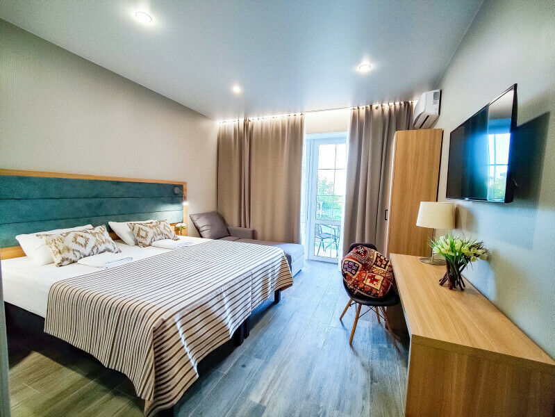 Трехэтажный корпус отеля разместился на закрытой благоустроенной территории. Жилой фонд предлагает отдыхающим номера разных категорий комфорта, в том числе и просторные номера, оснащенные кухней. В комнатах стильный современный интерьер, выдержанный в светлых оттенках, везде есть индивидуальный санузел с душем, необходимая техника — плазменный телевизор, фен, электрочайник, холодильник.