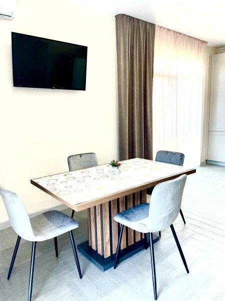 В комнате: двуспальная кровать шириной 1,80х2,0 м с ортопедическим матрасом, спилит система. Мини-кухня (на кухне: электрочайник, холодильник, микроволновая печь, набор посуды), шкаф для одежды, прикроватные столики, плазменный телевизор, CMAPТ-TV,бесплатный Wi-Fi.